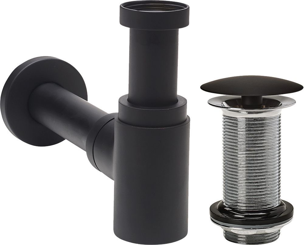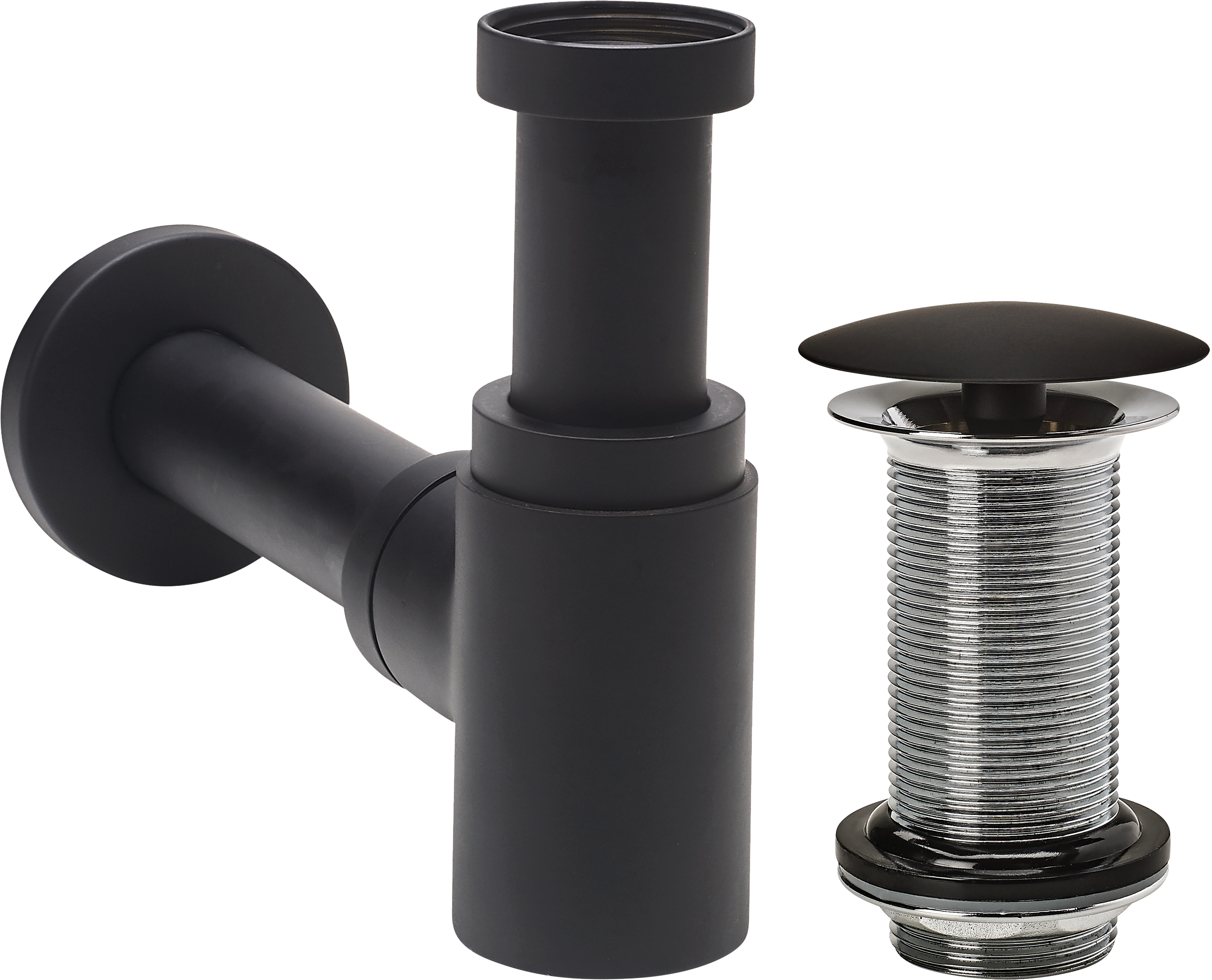 Комплект Сифон Wirquin Lineis 30722857 без выпуска 1/4 х 32 мм, черный + Донный клапан Фри Флоу 30722856 черный