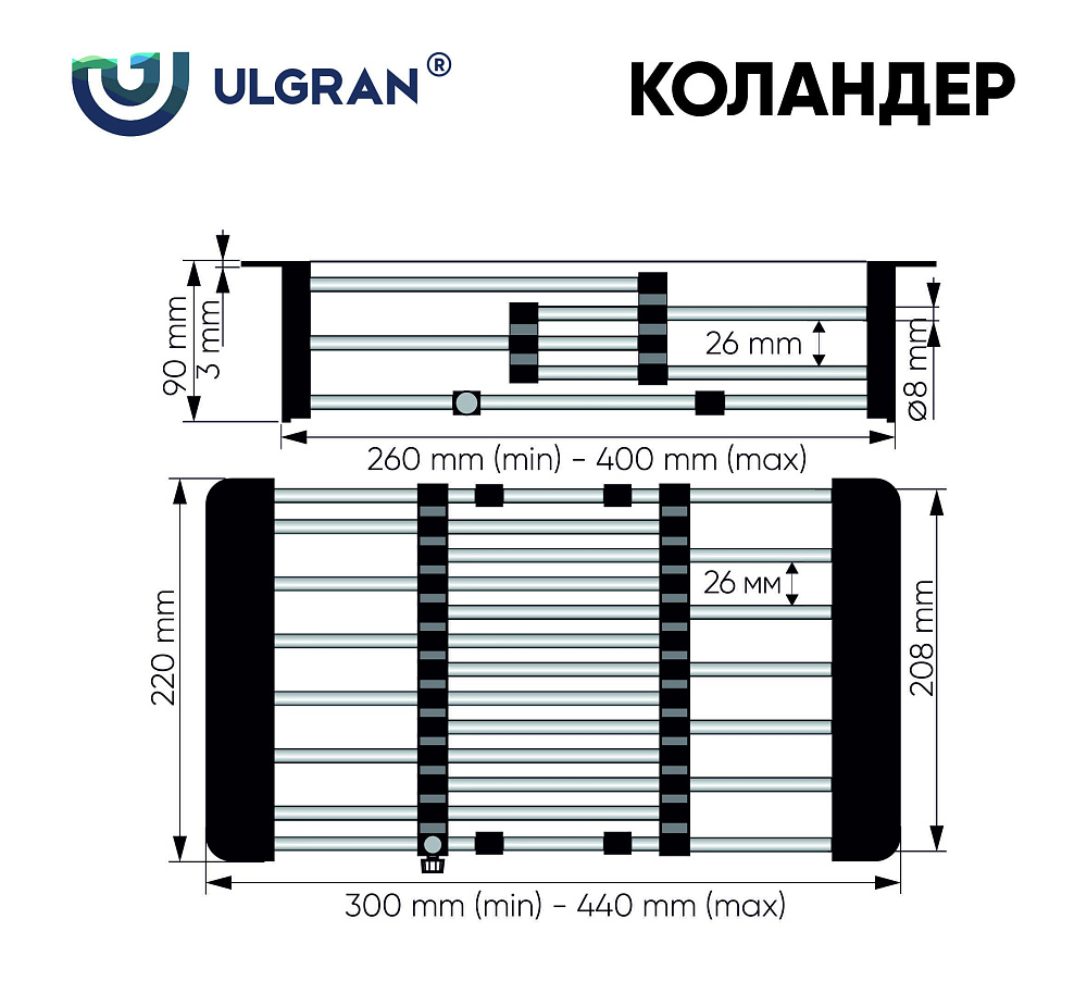 Коландер Ulgran телескопический — это универсальный аксессуар, который станет незаменимым помощником на вашей кухне. Изготовленный из высококачественных материалов, он отличается надёжностью и долговечностью. Благодаря телескопическим выдвижным направляющим из нержавеющей стали, коландер легко адаптируется к различным размерам моек. Его длина может варьироваться от минимальных 260 мм до максимальных 440 мм, что делает его совместимым с абсолютным большинством моделей моек Ulgran: круглыми, квадратными, прямоугольными, овальными и угловыми. Коландер Ulgran телескопический идеально подходит не только для разморозки продуктов, но и для мытья овощей и фруктов. Он поможет вам поддерживать порядок и чистоту на кухне, а также облегчит процесс подготовки продуктов к приготовлению блюд. Этот коландер — не просто инструмент, а надёжный помощник, который сделает вашу кулинарную деятельность более комфортной и приятной.