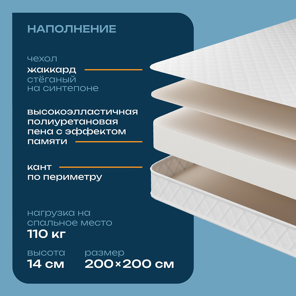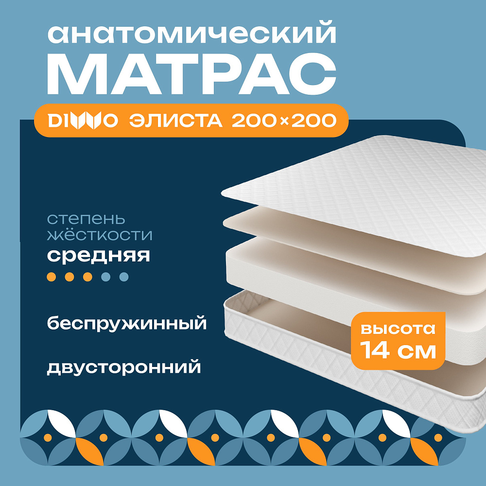 Хотите насладиться идеальным сном каждую ночь? Матрас DIWO Элиста 200х200, анатомический, беспружинный - идеальное решение для вашего комфорта и уюта в спальне!DIWO - бренд, который уже завоевал доверие многих потребителей благодаря своему качеству и надежности. Этот матрас несомненно порадует вас своими характеристиками. Средняя жесткость матраса и эффект памяти создадут идеальные условия для вашего отдыха. Вы забудете о бессонных ночах и боли в спине, ведь этот матрас анатомически подходит для вашего тела.Жаккард стеганый чехол на синтепоне придает матрасу не только стильный внешний вид, но и дополнительный комфорт. А двухсторонняя конструкция позволит вам выбрать оптимальную сторону в зависимости от ваших предпочтений.Сделанный в России, этот матрас обладает всеми необходимыми сертификатами качества и гарантией на 3 года, что подчеркивает его надежность.С размерами 200х200 см и высотой 14 см, этот матрас идеально подойдет для вашей спальни. И при этом его вес всего 9.9 кг и максимальная нагрузка до 110 кг делают его легким в уходе и удобным в использовании.Не теряйте возможность позаботиться о своем здоровье и комфорте! Приобретите матрас DIWO Элиста 200х200 прямо сейчас и ощутите разницу с первой ночи использования. Ведь заслуженный отдых - залог вашего благополучия!