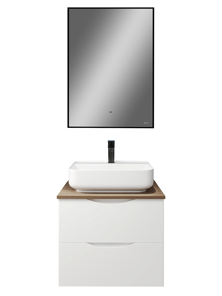 Мебель для ванной комнаты BOND Куб 60 подвесная, матовая белая, под дерево, с раковиной Cube S13-500, зеркало Cube M36ZE