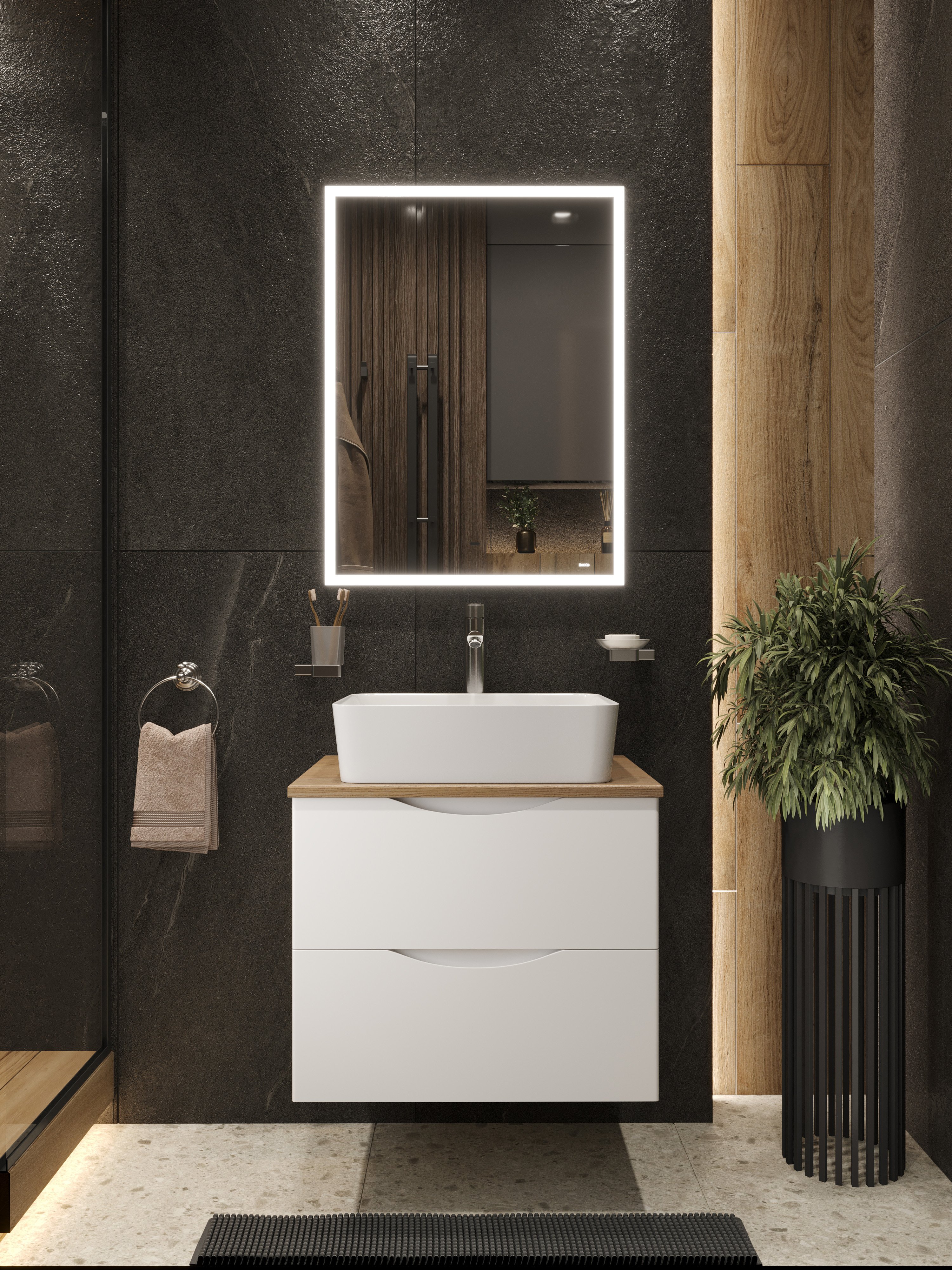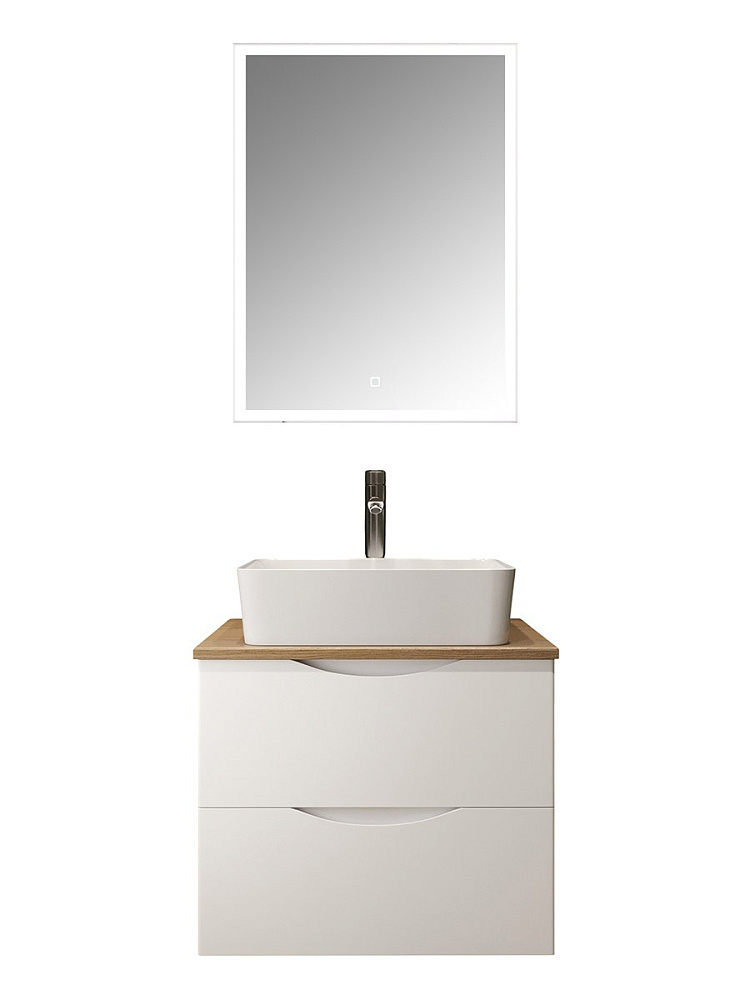 Мебель для ванной комнаты BOND Куб 60 подвесная, матовая белая, под дерево, с раковиной Cube S54-480, зеркало Cube M44ZE