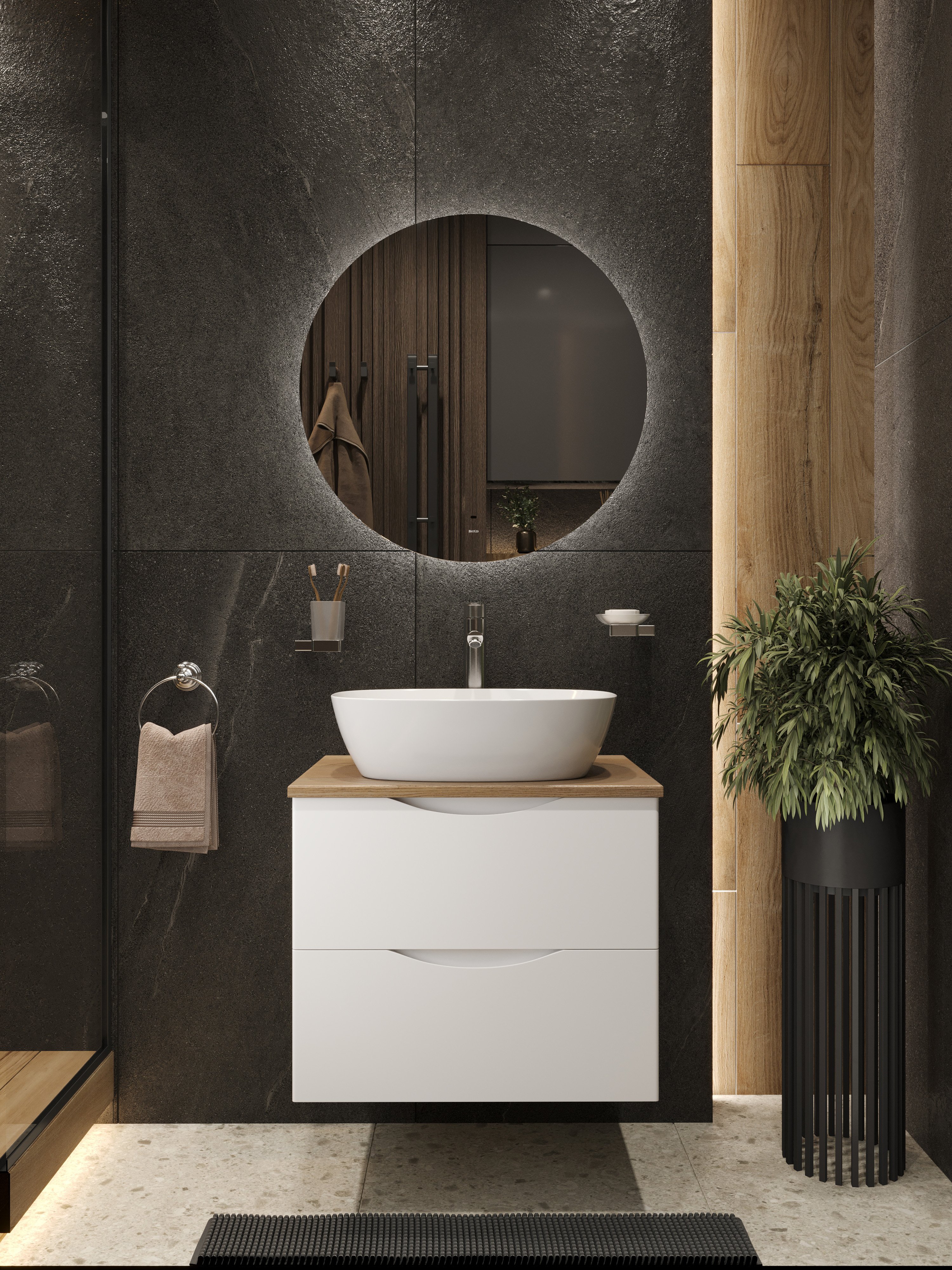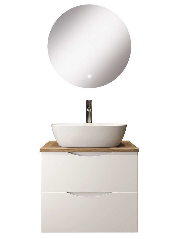 Мебель для ванной комнаты BOND Куб 60 подвесная, матовая белая, под дерево, с раковиной Cube S56-500, зеркало Circle M38ZE