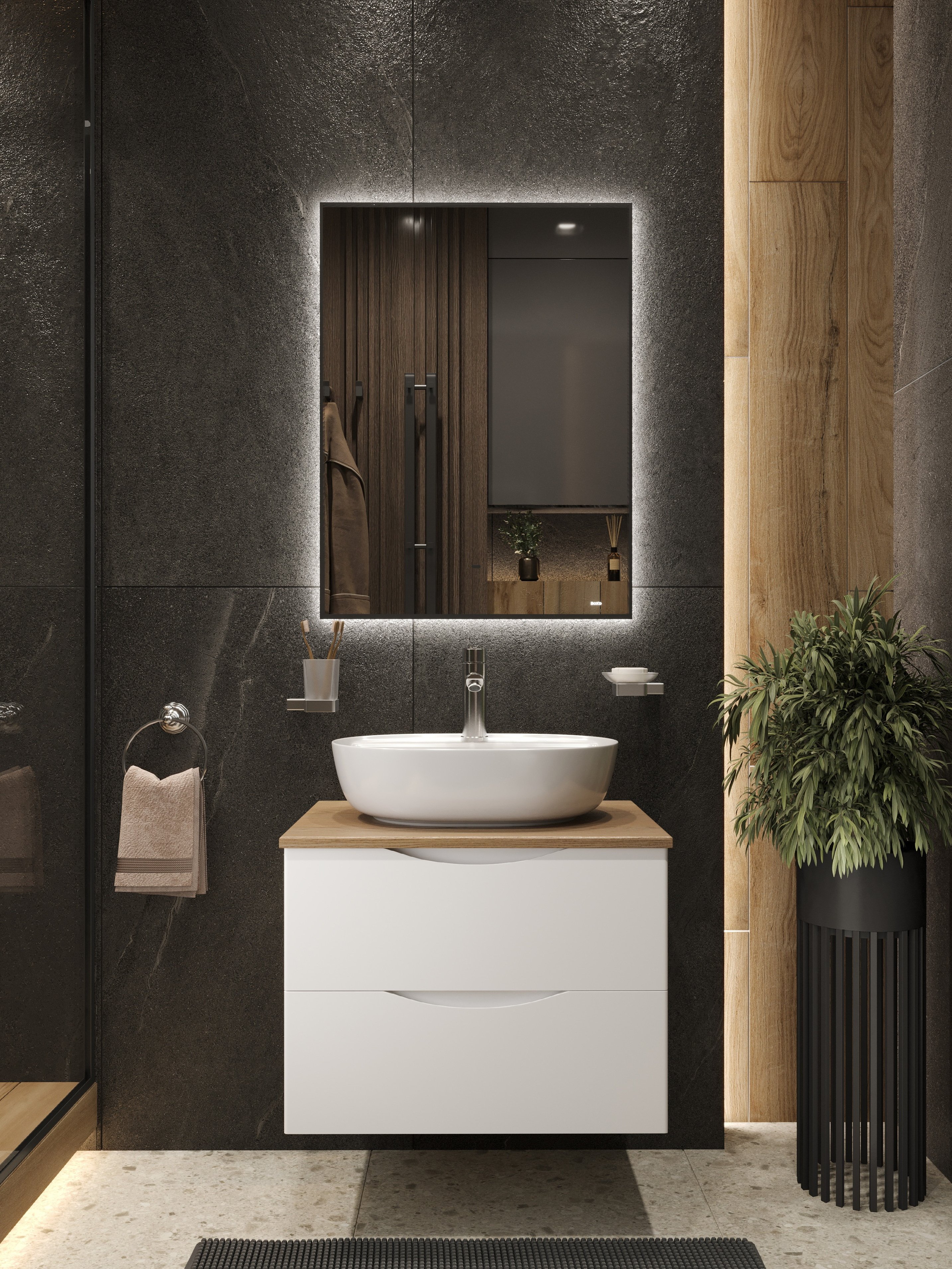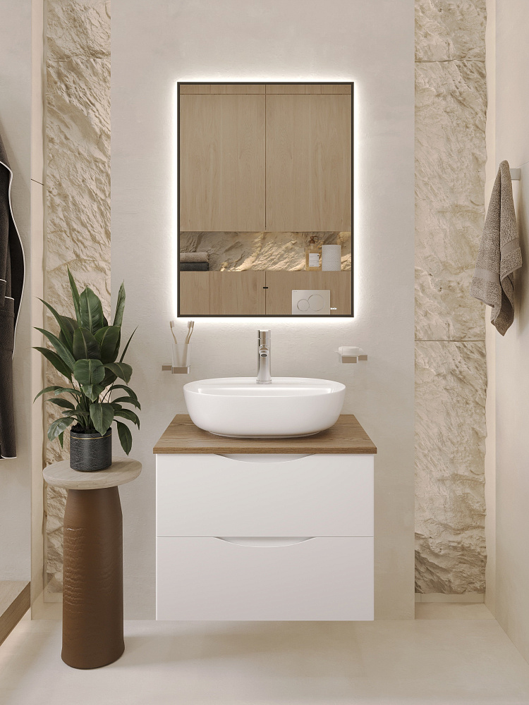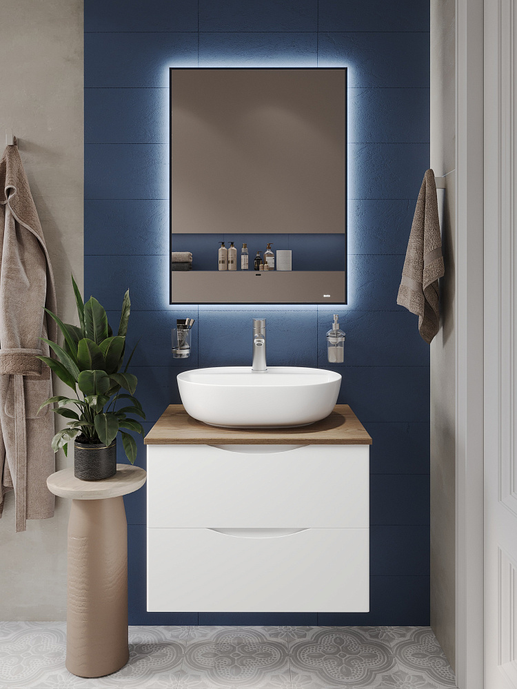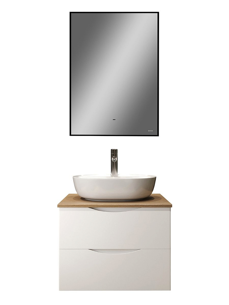 Мебель для ванной комнаты BOND Куб 60 подвесная, матовая белая, под дерево, с раковиной Oval S01-500, зеркало Cube M36ZE