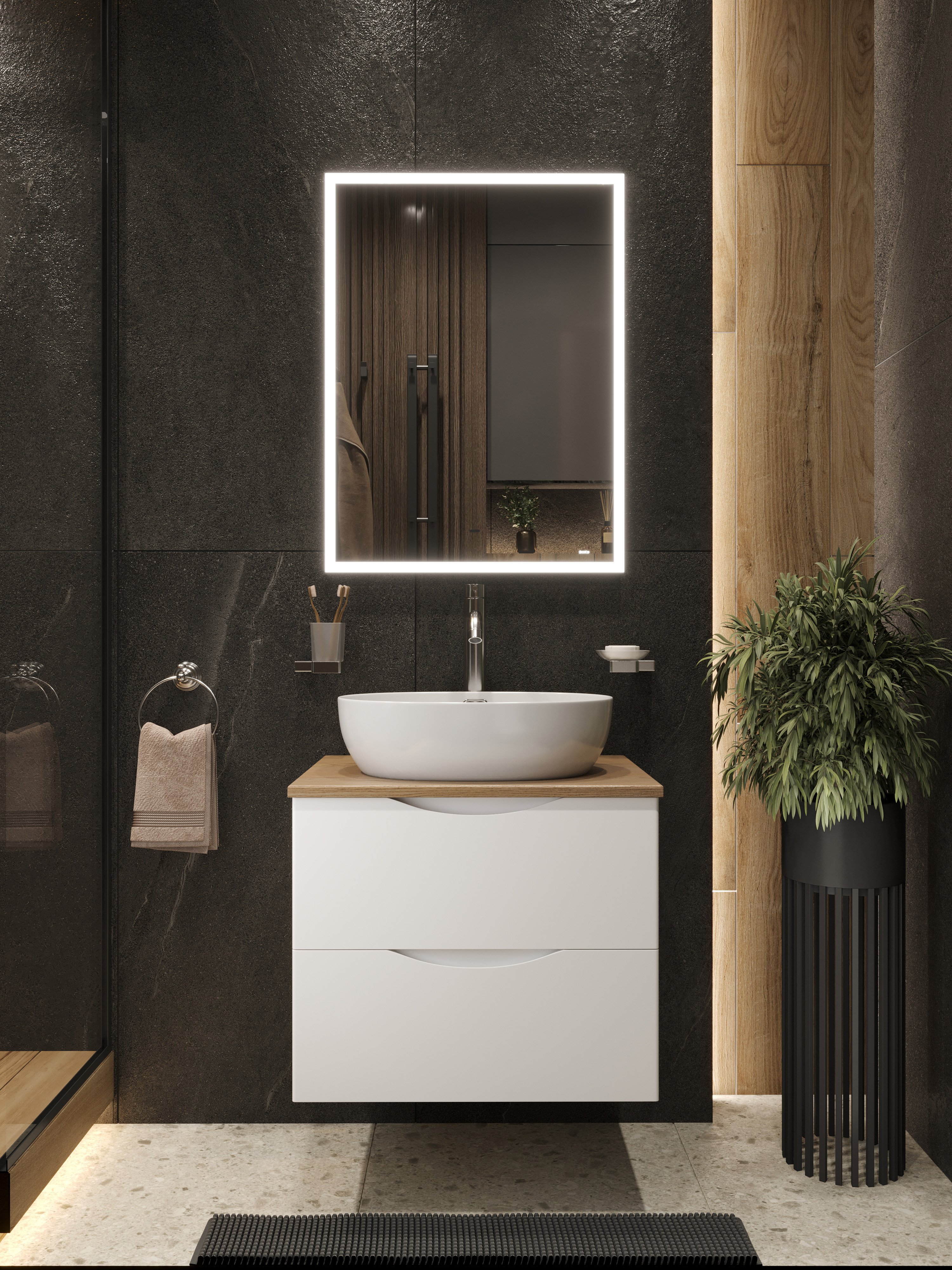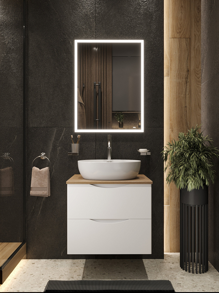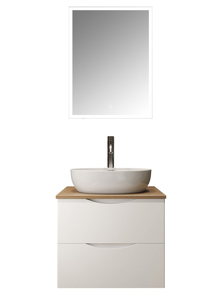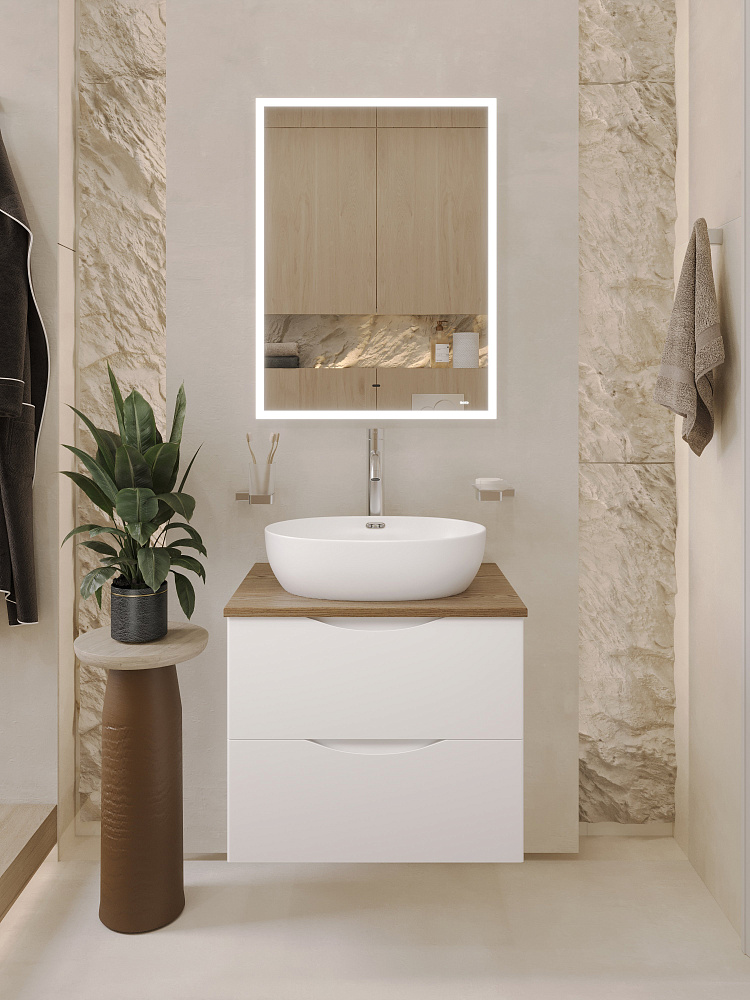 Мебель для ванной комнаты BOND Куб 60 подвесная, матовая белая, под дерево, с раковиной Oval S65-490, зеркало Cube M44ZE
