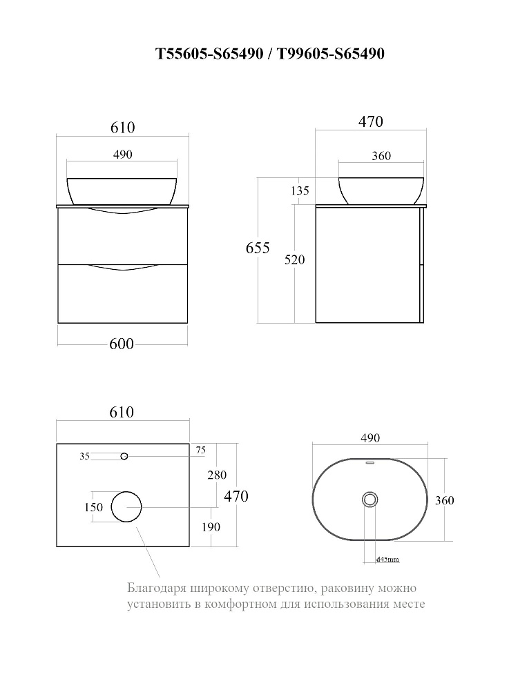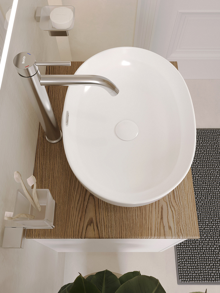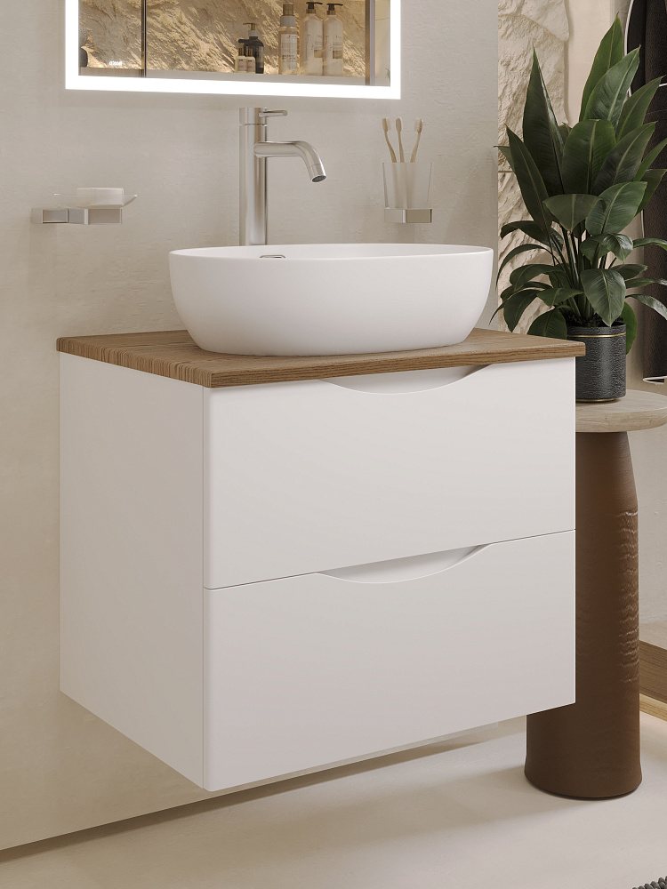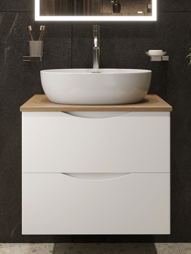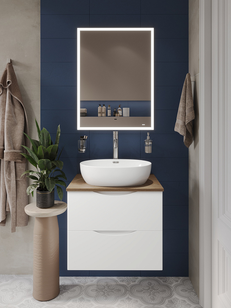Мебель для ванной комнаты BOND Куб 60 подвесная, матовая белая, под дерево, с раковиной Oval S65-490, зеркало Cube M44ZE
