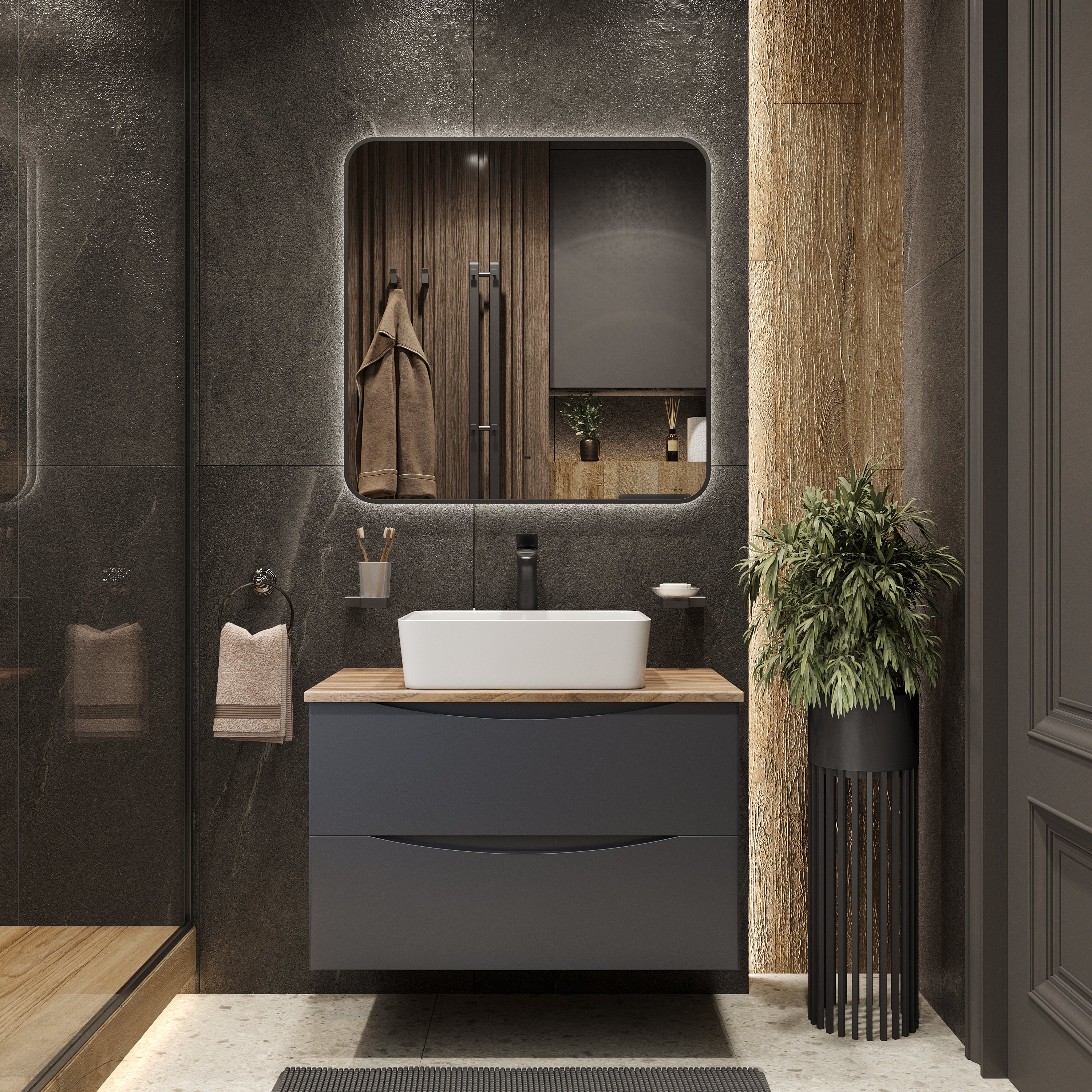 Мебель для ванной комнаты BOND Куб 80 подвесная, серая, под дерево, с раковиной Cube S54-480
