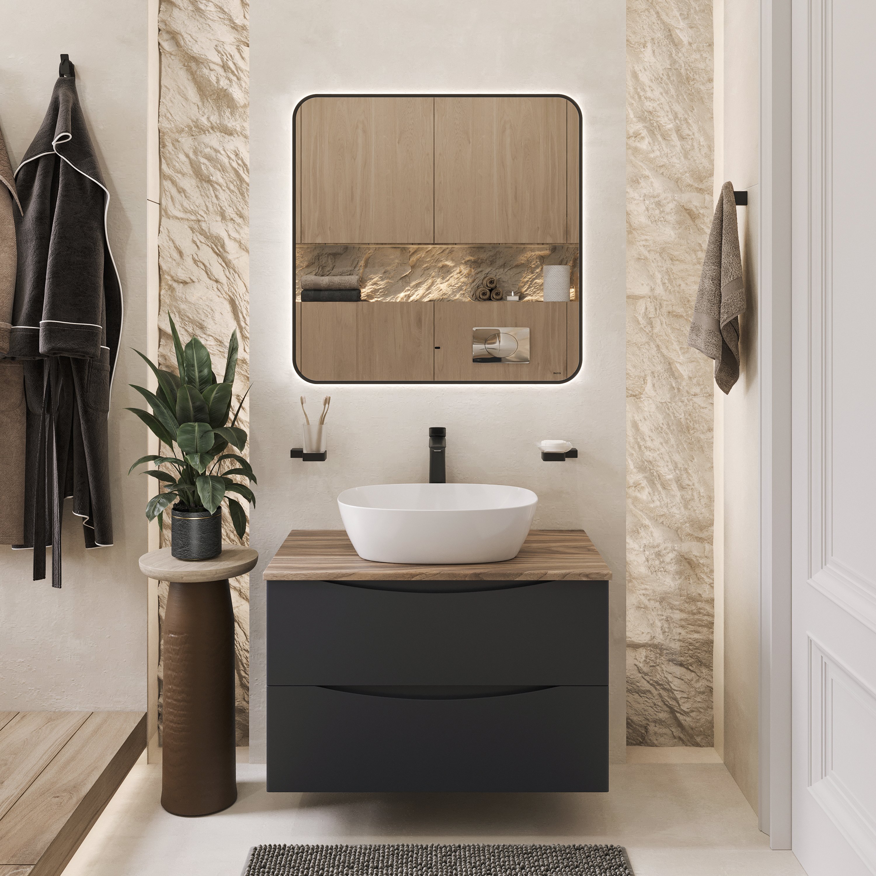 Мебель для ванной комнаты BOND Куб 80 подвесная, серая, под дерево, с раковиной Cube S56-500