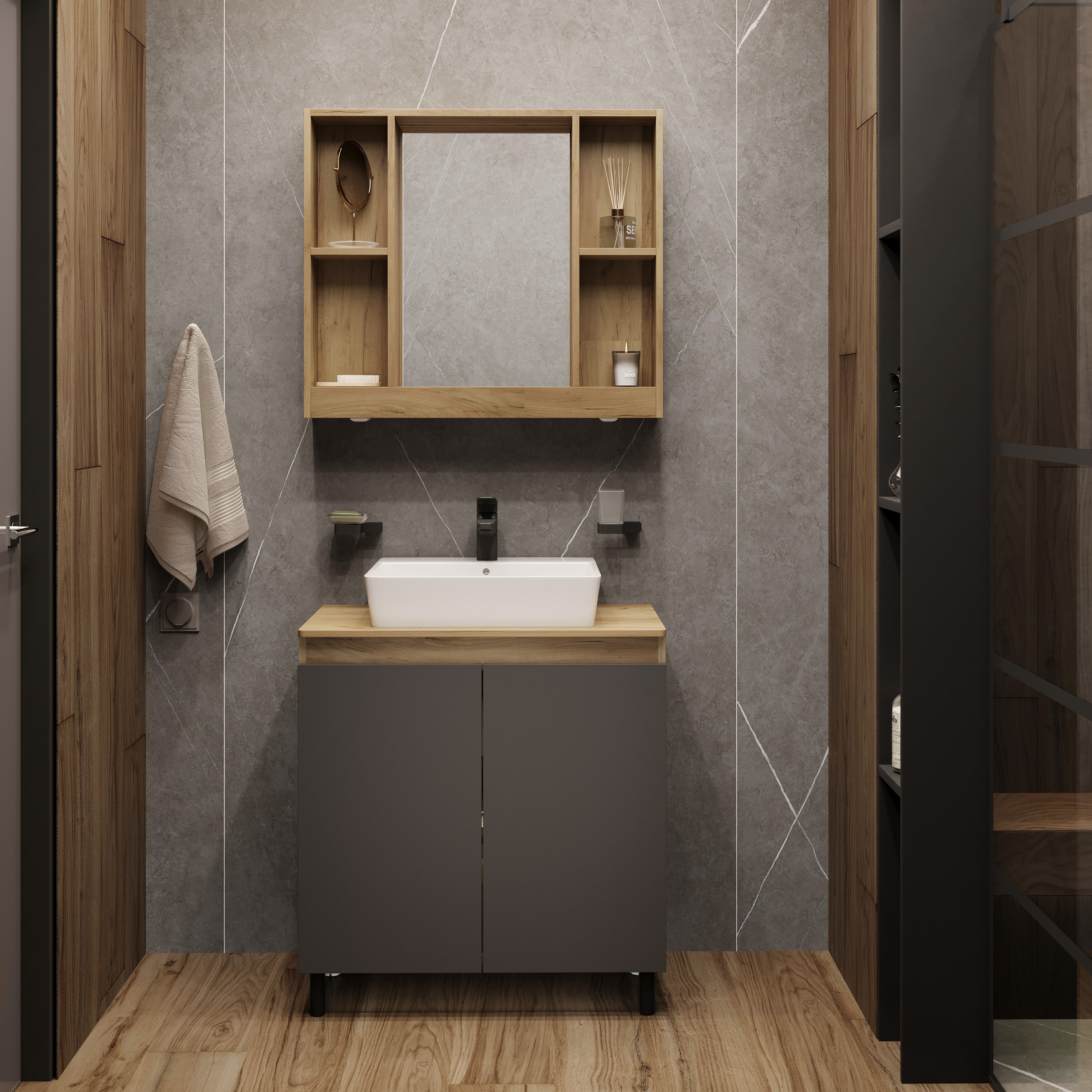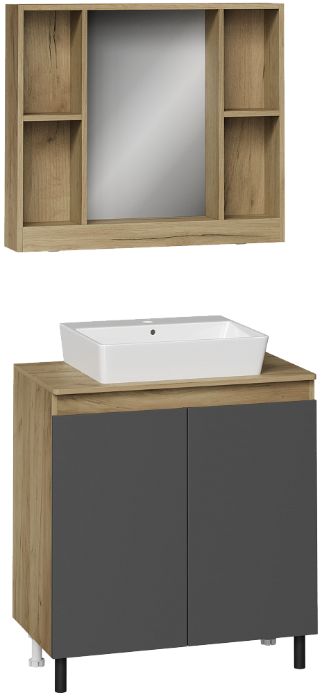 Мебель для ванной комнаты DIWO Кострома 80 напольная, антрацит, столешница дуб крафт, раковина Архангельск 50, зеркало Кострома