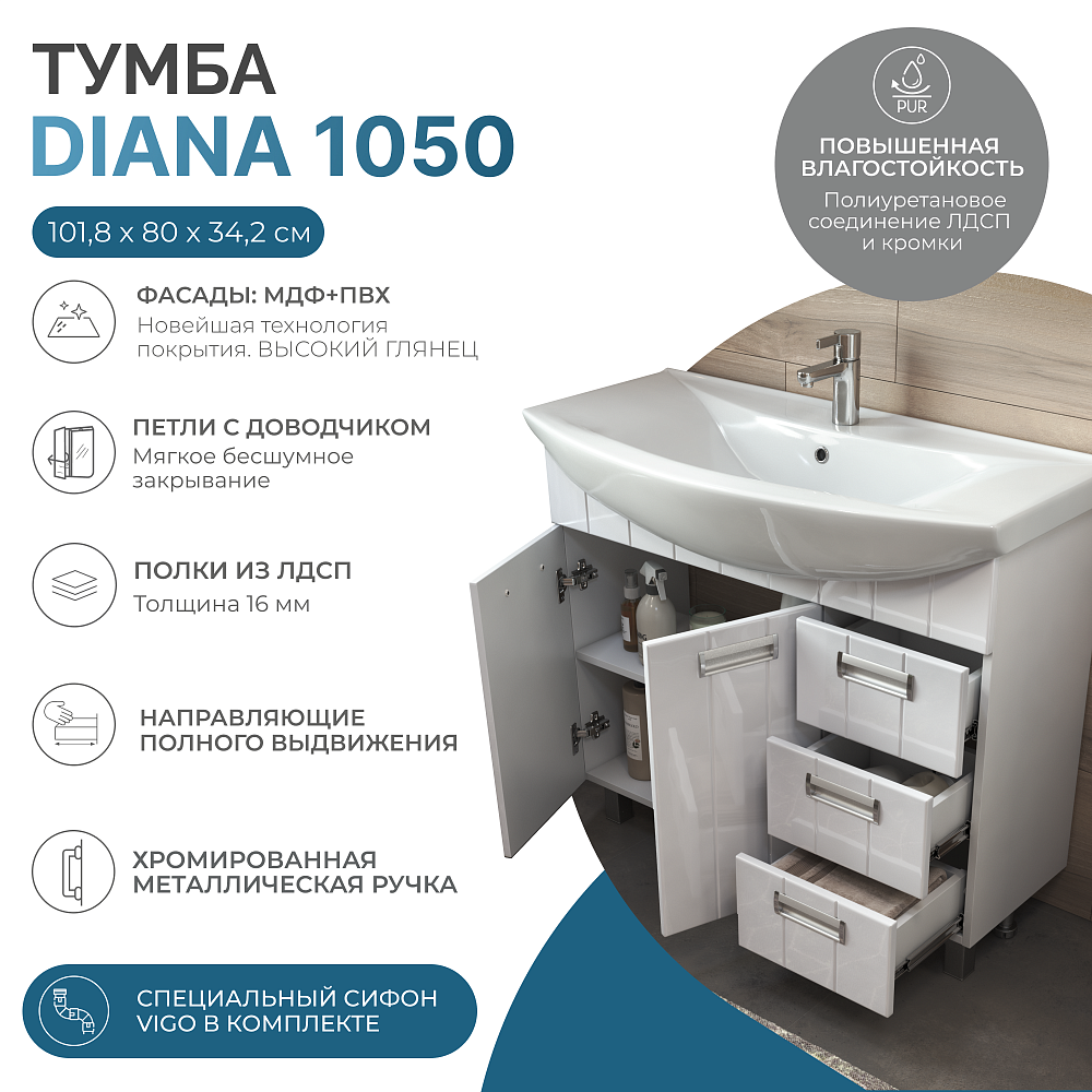 Отзывы о Мебель для ванной комнаты Vigo Diana 105 напольная, белая, раковина Стиль 105
