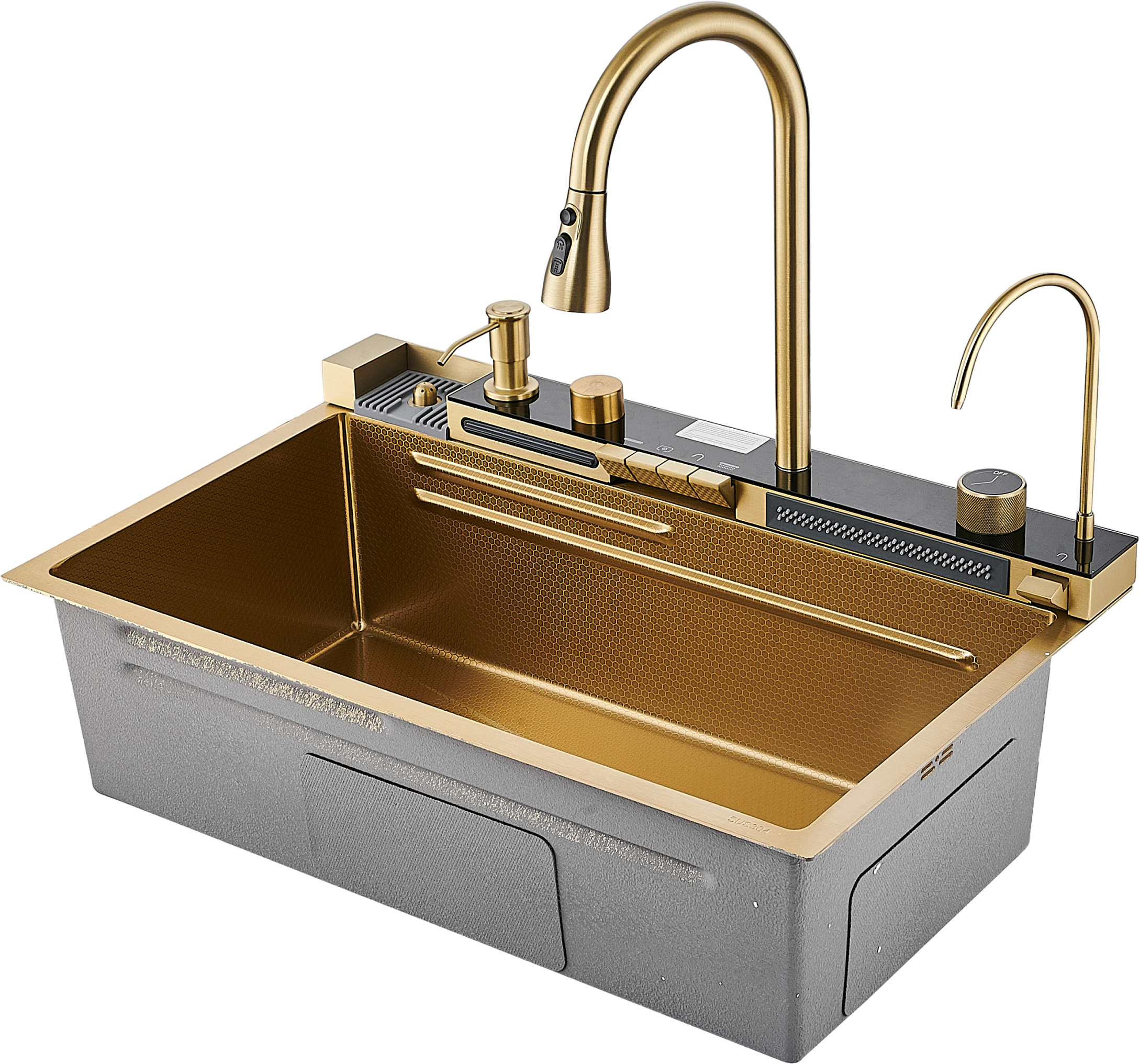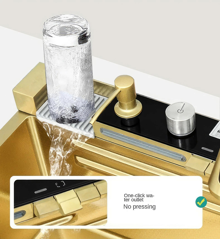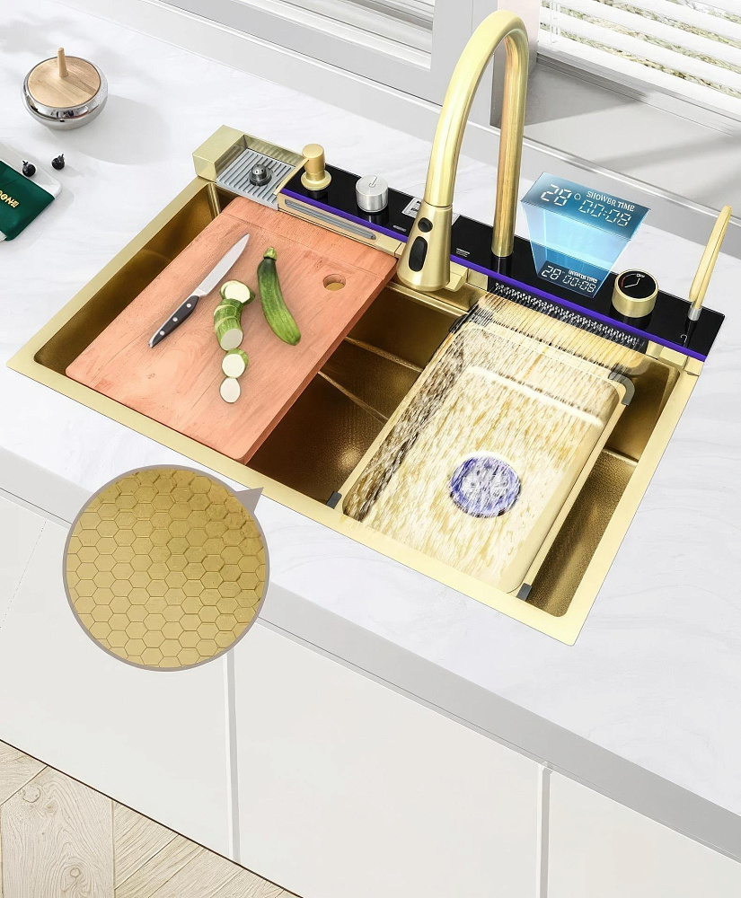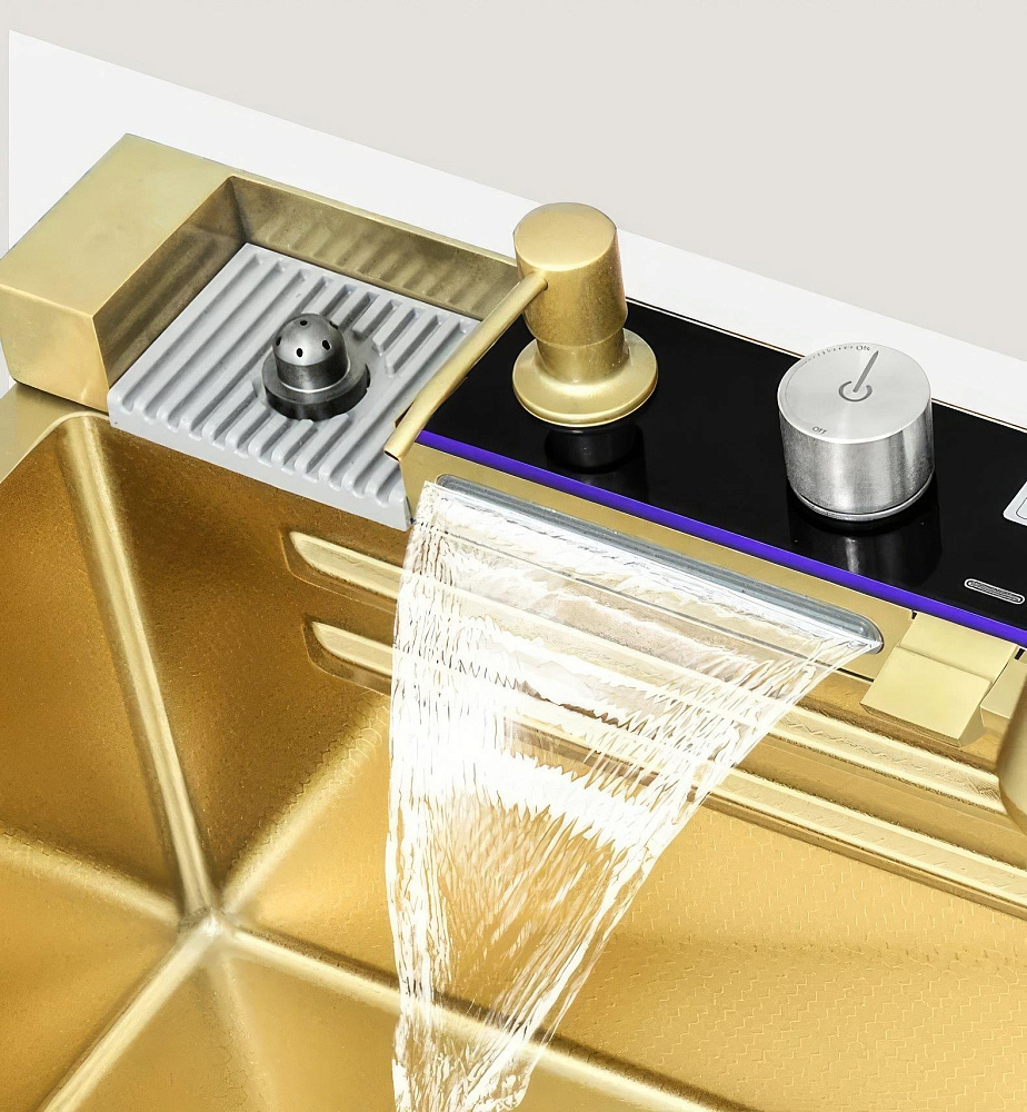 Комплект Savol S-SC001C с водопадом, матовое золото — это идеальное решение для вашей кухни. Он включает в себя мойку с панелью, на которой расположены смеситель, кран для питьевой воды (для подключения к фильтру) и функция ополаскивания стакана. Одним из главных преимуществ этого комплекта является наличие шумоизолирующего слоя и специальных накладок на обратной стороне мойки. Это позволяет снизить уровень шума во время использования и обеспечить долговечность и надёжность конструкции. Боковой отвод воды обеспечивает эффективное удаление загрязнений и предотвращает образование луж на поверхности мойки. Высококачественное покрытие в форме сот придаёт мойке большую износостойкость и помогает ей прекрасно сопротивляться воздействию агрессивных веществ. Это гарантирует долговечность и сохранение привлекательного внешнего вида на протяжении многих лет. Олеофобное покрытие на поверхности мойки облегчает процесс очистки от загрязнений и создаёт дополнительную антикоррозионную защиту. Благодаря этому покрытию, мойка сохраняет свой первоначальный вид и не подвержена воздействию влаги и химических веществ. Два режима душа позволяют выбрать оптимальный вариант для ополаскивания посуды или фруктов и овощей. Это делает использование мойки ещё более удобным и комфортным. Комплект Savol S-SC001C — это не просто мойка, это функциональное и эстетичное решение для вашей кухни. Он сочетает в себе высокое качество, удобство использования и привлекательный внешний вид, делая вашу кухню ещё более комфортной и стильной.
