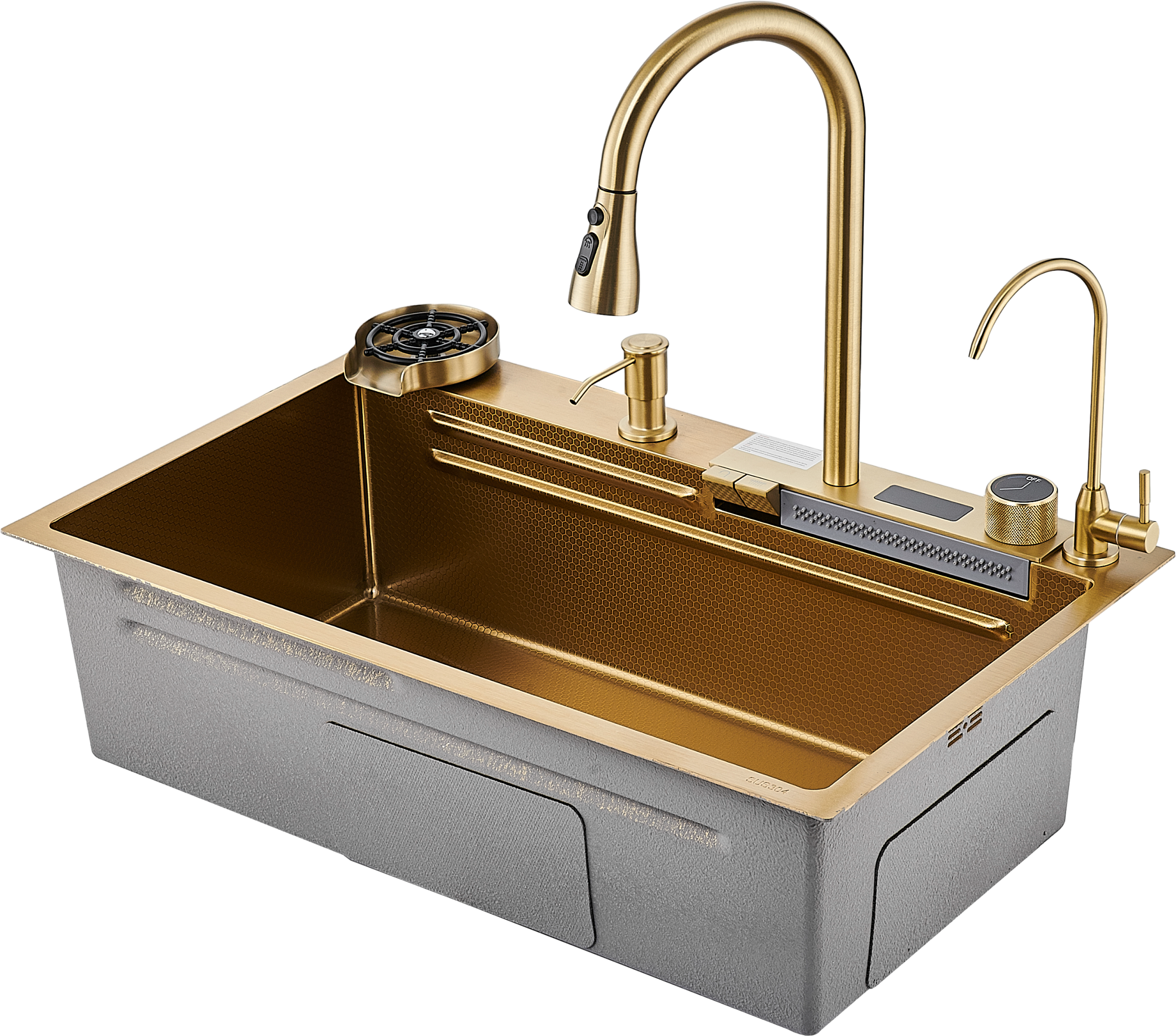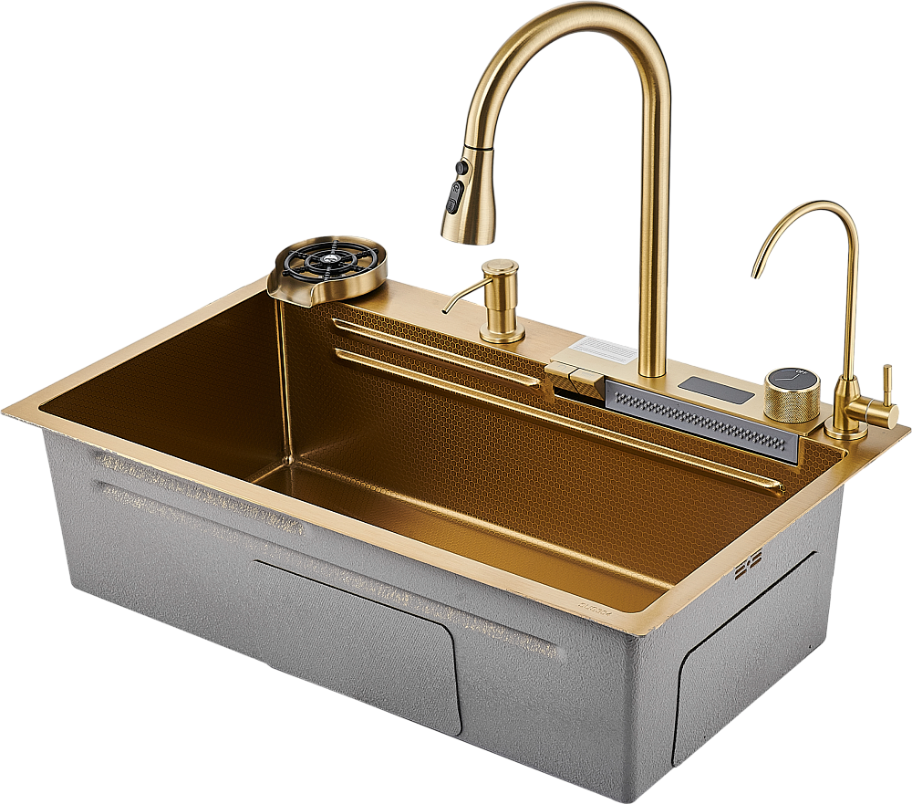 Комплект Savol S-SC002C с водопадом, матовое золото — это идеальное решение для вашей кухни. Он включает в себя мойку с панелью, на которой расположены смеситель, кран для питьевой воды (для подключения к фильтру) и функция ополаскивания стакана. Одним из главных преимуществ этого комплекта является наличие шумоизолирующего слоя и специальных накладок на обратной стороне мойки. Это обеспечивает тишину и комфорт во время использования, а также предотвращает появление нежелательных звуков при работе смесителя. Боковой отвод воды позволяет эффективно управлять потоком воды и предотвращает разбрызгивание, что делает использование мойки более удобным и гигиеничным. Высококачественное покрытие в форме сот придаёт мойке большую износостойкость и защищает её от воздействия агрессивных веществ. Это гарантирует долговечность и сохранение привлекательного внешнего вида мойки на протяжении многих лет. Олеофобное покрытие на поверхности мойки облегчает процесс очистки от загрязнений и создаёт дополнительную антикоррозионную защиту. Благодаря этому покрытию, мойка легко очищается от жира, пятен и других загрязнений, сохраняя свой первоначальный блеск и чистоту. Два режима душа позволяют настроить интенсивность струи воды в соответствии с вашими потребностями. Это делает использование мойки ещё более удобным и приятным. Комплект Savol S-SC002C — это не просто мойка, это продуманное и функциональное решение для вашей кухни, которое сочетает в себе комфорт, стиль и высокое качество исполнения.