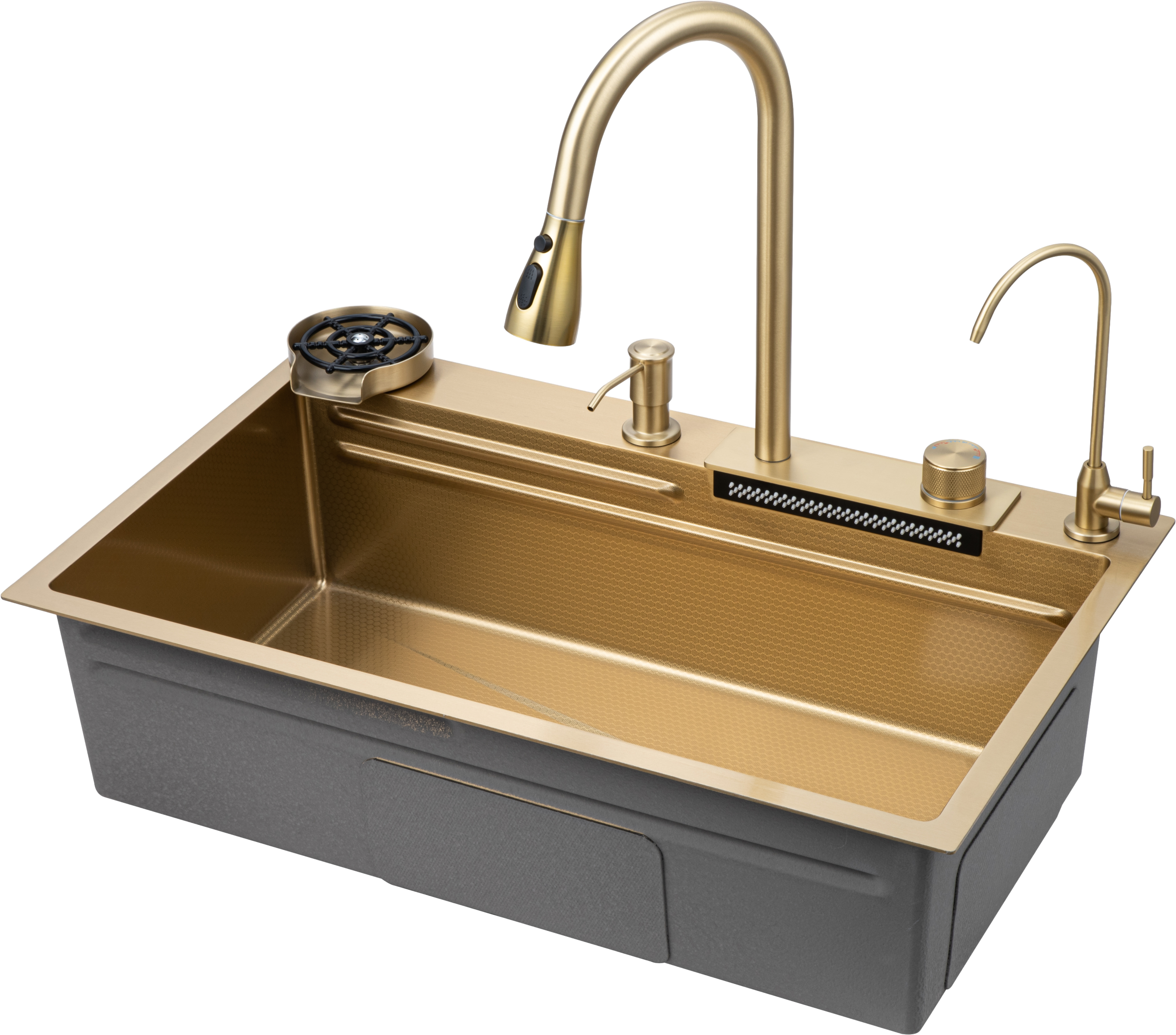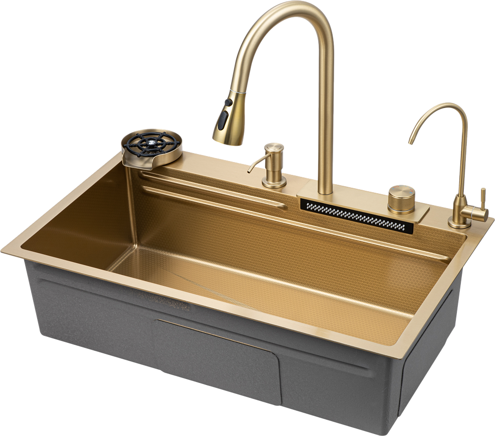 Комплект Savol S-SC003C с водопадом, матовое золото — это идеальное решение для вашей кухни. Он включает в себя мойку с панелью, смесителем, краном для питьевой воды и функцией ополаскивания стакана. Благодаря высококачественному покрытию в форме сот, мойка обладает большой износостойкостью и прекрасно сопротивляется воздействию агрессивных веществ. Это гарантирует долговечность и сохранение привлекательного внешнего вида на протяжении многих лет. Олеофобное покрытие на поверхности мойки облегчает процесс очистки от загрязнений. Оно создаёт дополнительную антикоррозионную защиту, что особенно важно для сохранения качества и внешнего вида изделия. Шумоизолирующий слой и специальные накладки на обратной стороне мойки обеспечивают тишину и комфорт во время использования. Вы больше не будете испытывать дискомфорт от шума воды. Боковой отвод воды позволяет эффективно управлять потоком и предотвращает разбрызгивание, что способствует поддержанию чистоты и порядка на кухне. Два режима душа обеспечивают гибкость в использовании и позволяют выбрать оптимальный вариант для различных задач. Это делает процесс мытья посуды и овощей ещё более удобным и приятным. Комплект Savol S-SC003C — это не просто мойка, это инвестиция в комфорт, стиль и долговечность вашей кухни. Наслаждайтесь каждым моментом, проведённым за приготовлением пищи, с этим высококачественным и функциональным комплектом.