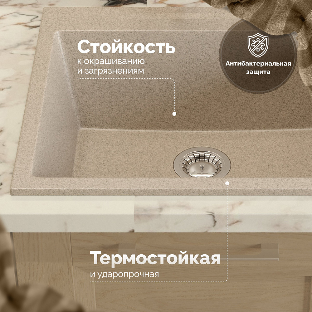 Мойка кухонная Domaci «Болонья М-44-004» песочного цвета — это идеальное решение для вашей кухни. Она сочетает в себе превосходный дизайн, прочность и функциональность. Двухконтурная поверхность чаши с шероховатым дном и гладкими стенками обеспечивает противоскользящий эффект, что делает использование мойки более безопасным. Кроме того, такая поверхность исключает разбрызгивание воды даже при сильном напоре, что помогает поддерживать чистоту на кухне. Верхний слой гелькоут образует декоративно-защитное покрытие с антибактериальным эффектом. Это не только придаёт мойке эстетичный вид, но и обеспечивает дополнительную защиту от микробов и бактерий. Сочетание мраморной крошки и акриловых смол делает материал мойки в 8 раз прочнее натурального мрамора. Это гарантирует долговечность и надёжность мойки, а также устойчивость к механическим повреждениям и царапинам. Продукция Domaci абсолютно безопасна. Эмиссия вредных веществ равна 0%, что подтверждается отсутствием характерного полихимического запаха. Вы можете быть уверены в качестве и безопасности мойки. Мойка кухонная Domaci «Болонья М-44-004» песочного цвета станет прекрасным дополнением к вашей кухне. Она сочетает в себе стильный дизайн, прочность, функциональность и безопасность, что делает её идеальным выбором для любого дома.