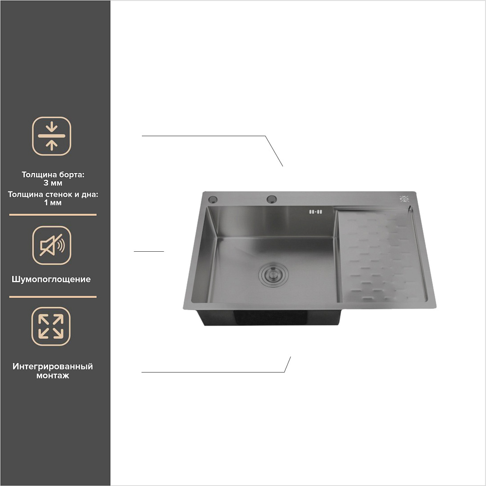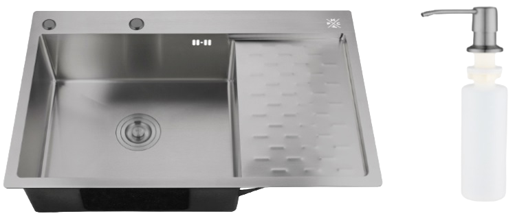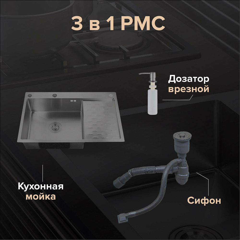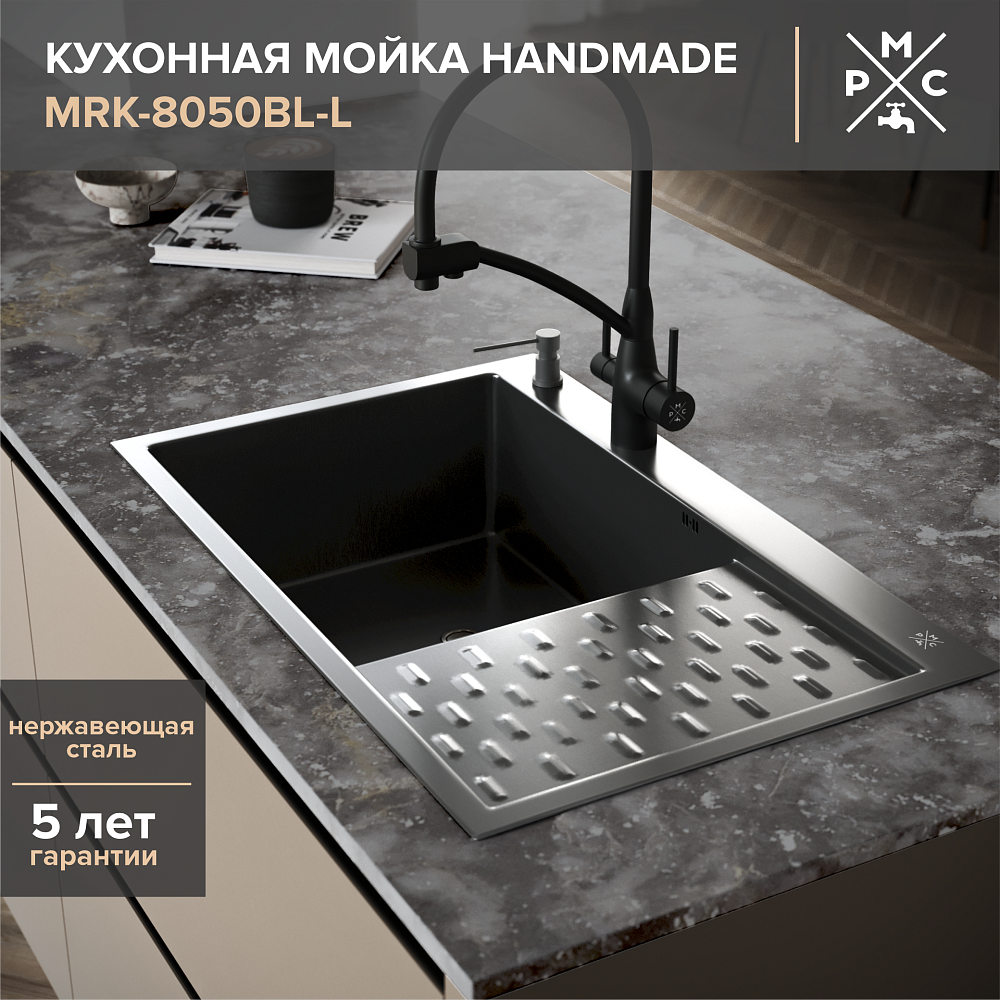 Мойка кухонная РМС MRK-8050BL-L с дозатором — это стильное и практичное решение для вашей кухни. Изготовленная из высококачественной нержавеющей стали, она отличается прочностью и долговечностью. Чёрный цвет мойки придаёт кухне современный и элегантный вид, легко сочетается с различными стилями интерьера и дополняет общую концепцию кухонного пространства.Благодаря продуманной конструкции с дозатором, мойка обеспечивает удобство использования и гигиеничность. Толщина стали в 1–3 мм гарантирует надёжность и устойчивость к механическим повреждениям. Поверхность мойки устойчива к царапинам и не теряет блеска со временем, что делает её идеальным выбором для любой кухни.Нержавеющая сталь — это не только эстетически привлекательный материал, но и практичный в уходе. За мойкой легко ухаживать, она не требует специальных чистящих средств и сохраняет свой первоначальный вид на протяжении многих лет. Кроме того, мойка обладает хорошей устойчивостью к температурным перепадам, что делает её надёжным элементом кухонной сантехники.Выбирая мойку РМС MRK-8050BL-L, вы получаете не только стильный и функциональный элемент для вашей кухни, но и гарантию качества от производителя. Эта мойка станет незаменимым помощником на вашей кухне, обеспечивая комфорт и удобство при приготовлении пищи.