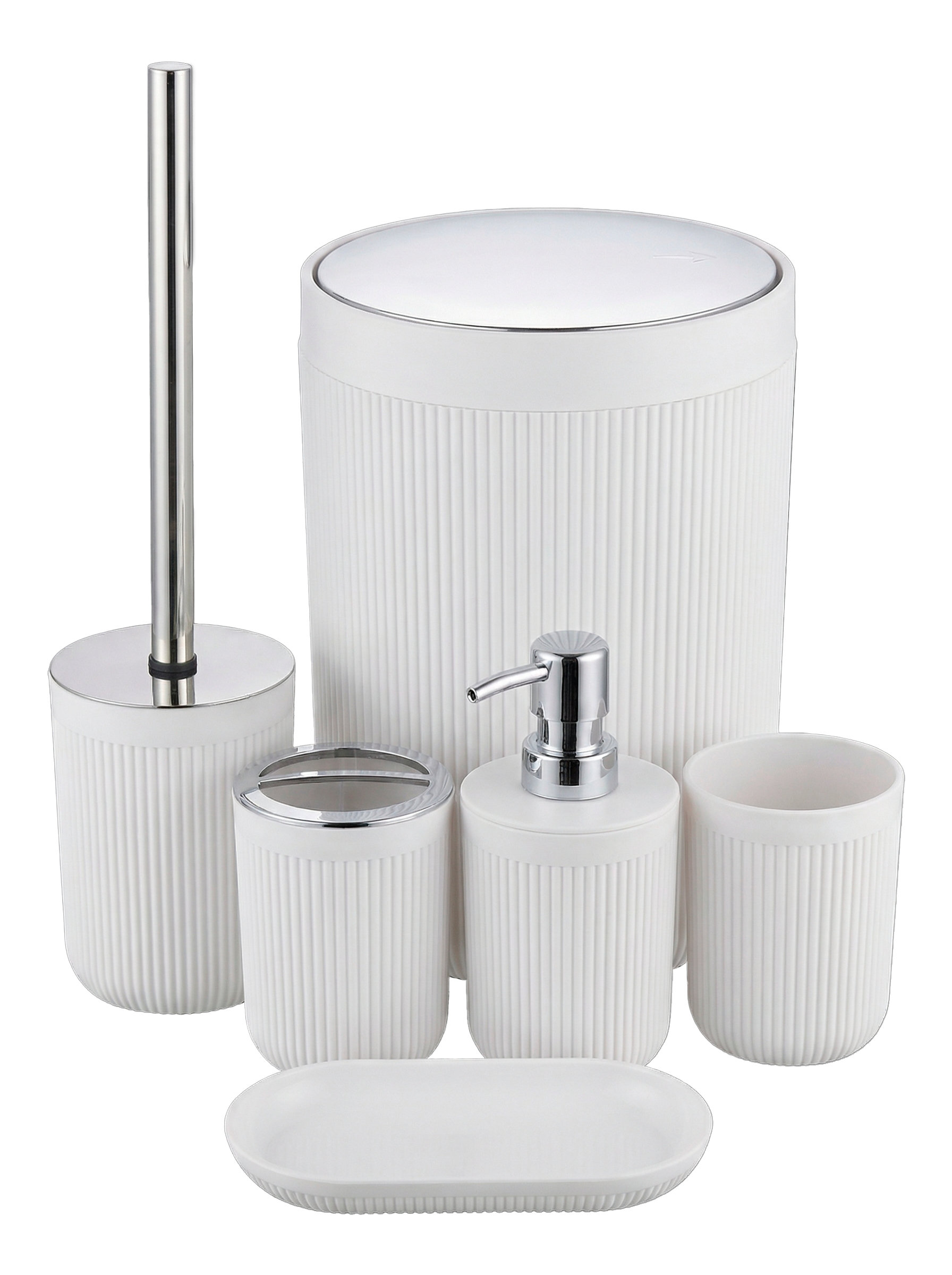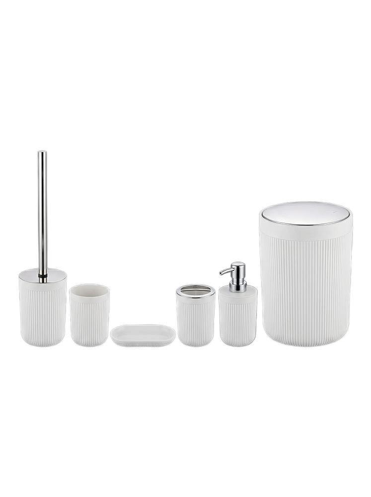 Комплект аксессуаров для ванной комнаты выполнен из прочного и влагостойкого пластика, который прост в уходе и подходит для ежедневного использования. В набор входят все необходимые элементы для поддержания порядка: стаканчик размером 7,5×7,5×10,5 см, дозатор для жидкого мыла 7,6×7,6×16,5 см, плоская мыльница 16,5×8,5×2 см, стакан для зубных щёток 7,5×7,5×10,5 см, а также туалетный ёршик 8,5×8,5×26 см и мусорное ведро 17,6×17,6×26 см.