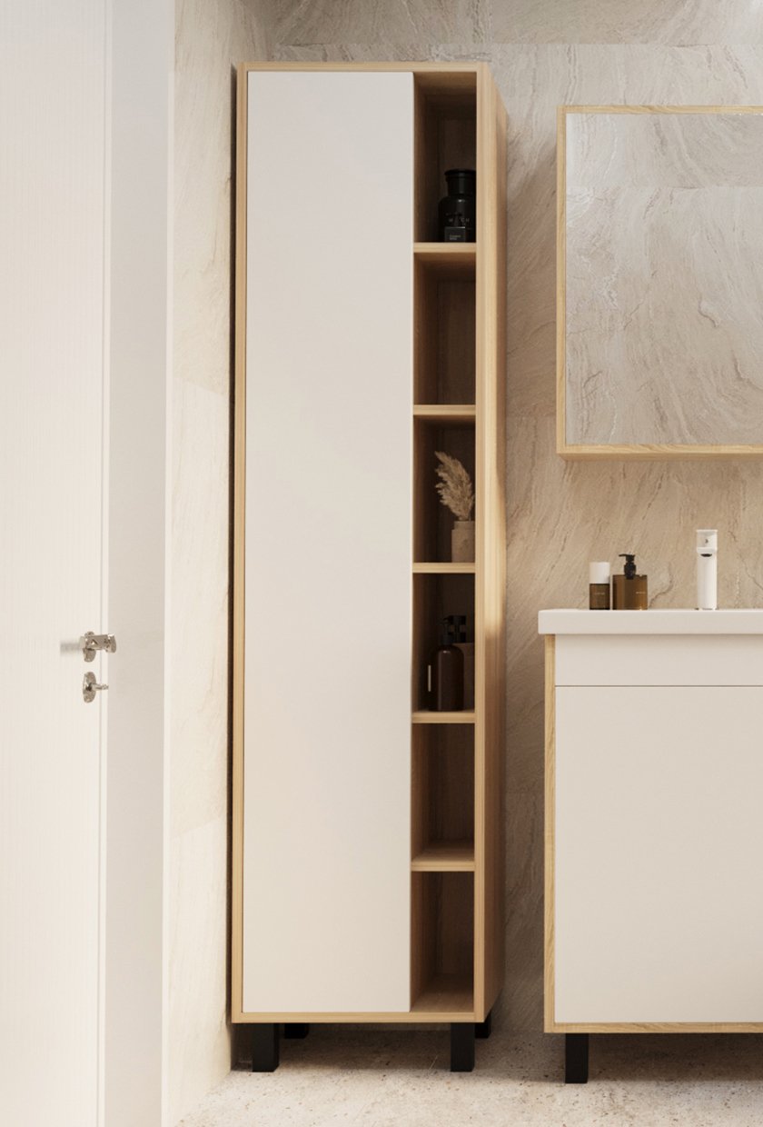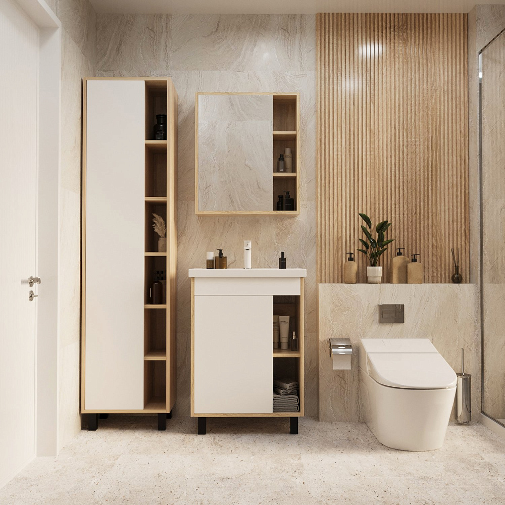Коллекция отличается сочетанием классической отделкой под дерево и нейтральным белым цветом, что позволяет ей гармонично вписаться в интерьер ванной комнаты, подчеркивая его современный характер.