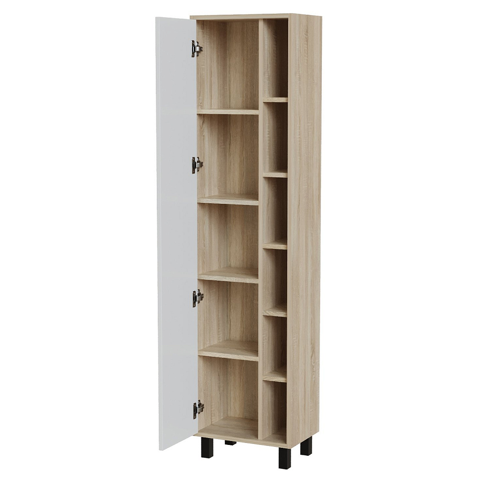 Напольнаый пенал с распашной дверцей и открытыми нишами для хранения. Внутри 4 полки из ЛДСП. Петли на дверце оснащены доводчиками. Дверца пенала изготовлена из МДФ и облицована белой матовй пленкой ПВХ белый софт. Корпус тумбы изготовлен из влагостойкого ЛДСП. Пенал устанавливается на четыре регулируемые опоры и фиксируется к стене при помощи креплений.