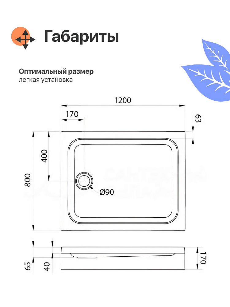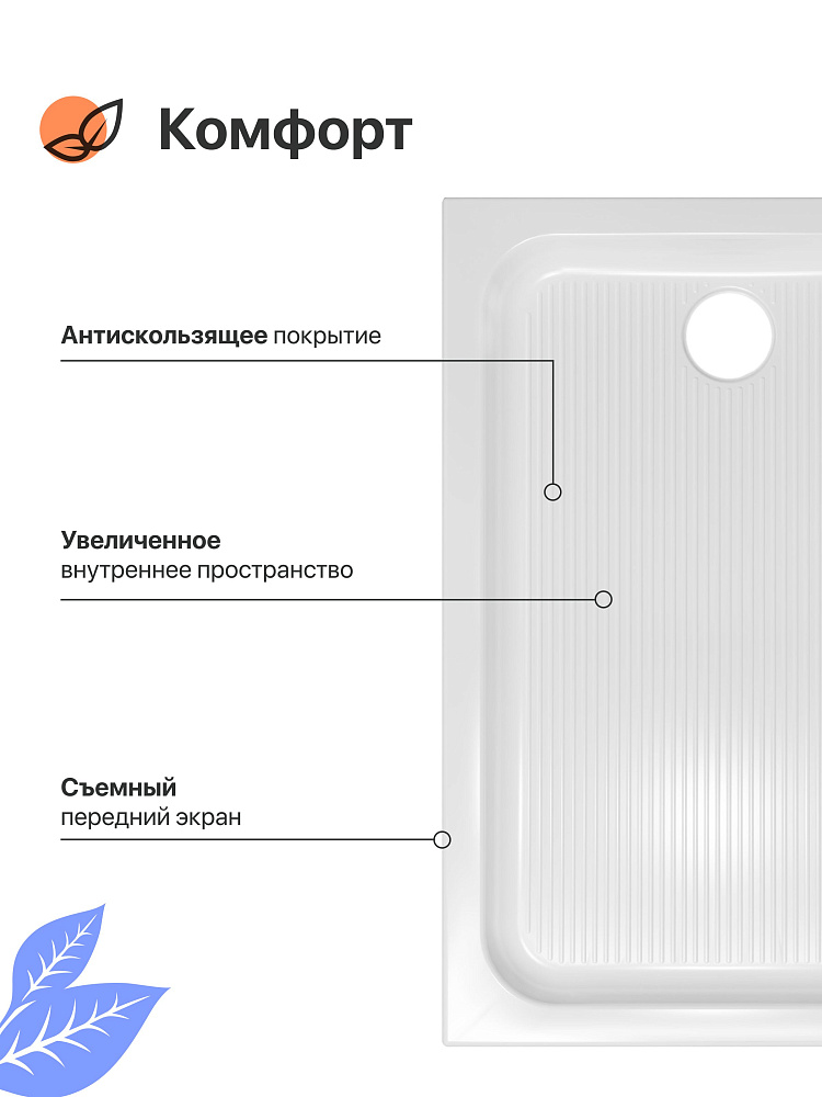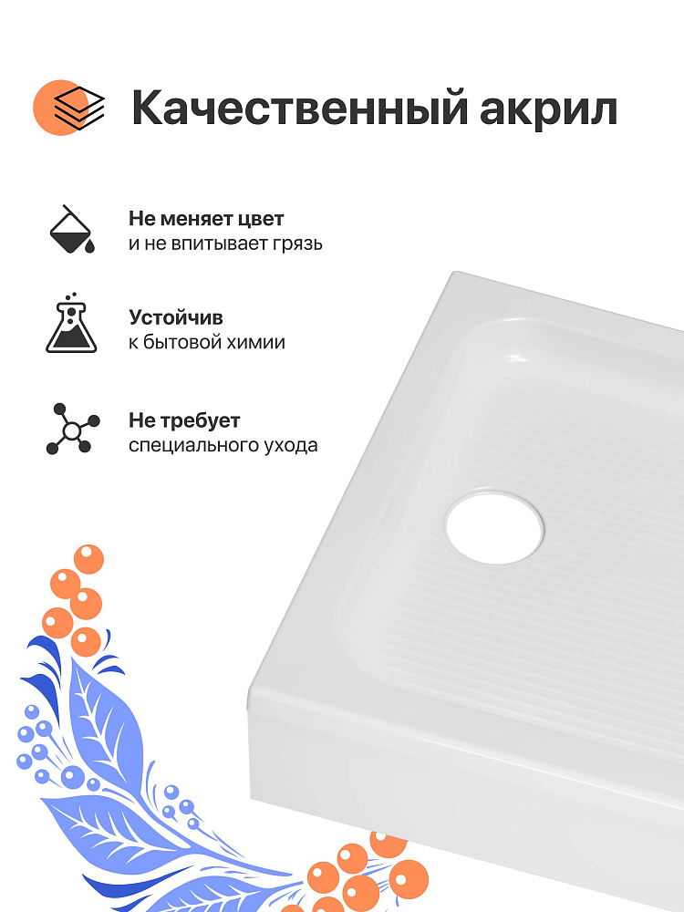 Прямоугольный поддон производится в России из качественного акрила, устойчивого к бытовой химии. Поверхность не впитывает грязь и сохраняет первоначальный цвет. Специального ухода не требуется. Дизайн эргономичен — ничего лишнего. Передний экран снимается для легкого доступа к коммуникациям.