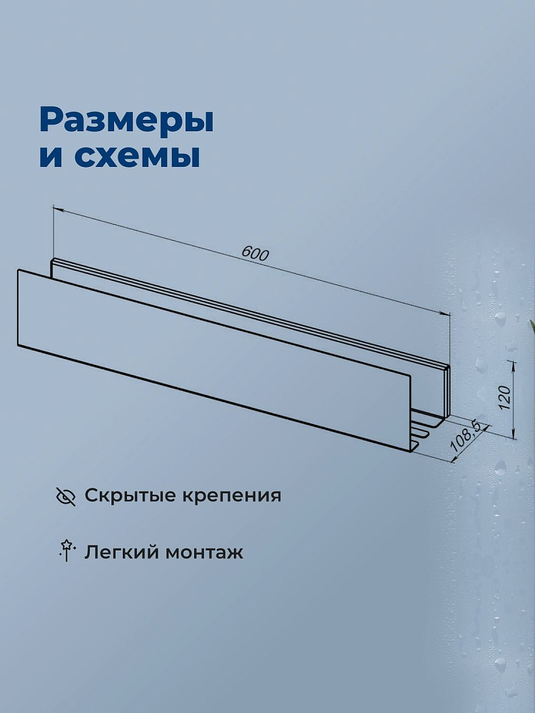 Полка оснащена скрытыми креплениями, что обеспечивает аккуратный внешний вид. В комплекте идут схемы для точной разметки, что упрощает процесс установки.