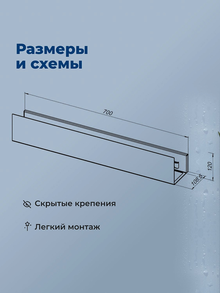 Полка оснащена скрытыми креплениями, что обеспечивает аккуратный внешний вид. В комплекте идут схемы для точной разметки, что упрощает процесс установки.