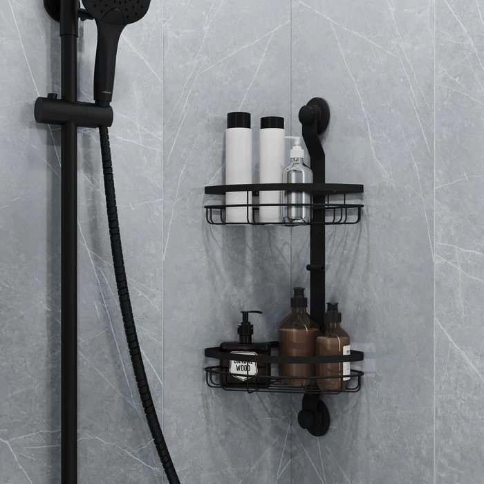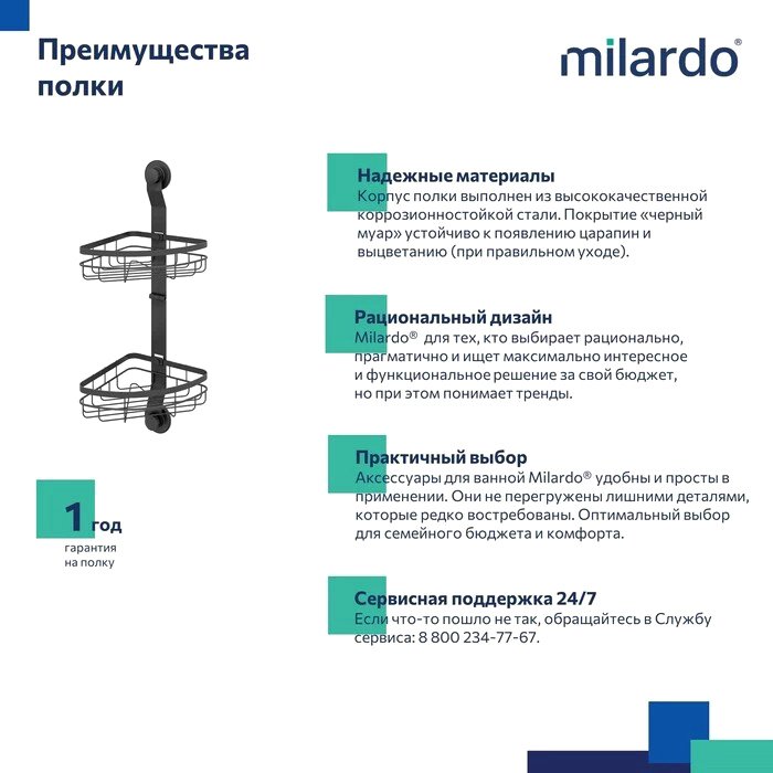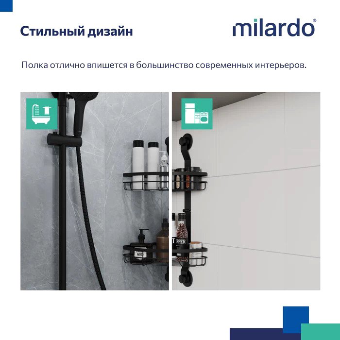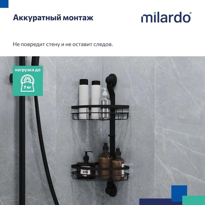 Полка из коллекции Easy подходит для многих интерьерных решений и поддержания порядка в ванной или на кухне. Угловая конструкция позволяет использовать имеющееся пространство более рационально, а большое расстояние между ярусами (27,9 см) – размещать даже высокие бутылочки. Эта модель монтируется двумя фиксаторами на клеевой слой, дополнительно усиленный вакуумом, что увеличивает сцепку клеевой основы с поверхностью стены. В отличие от изделий из пластика полка Milardo® может выдерживать высокую (до 7 кг) нагрузку. Она монтируется без сверления, а значит можно не опасаться повредить красивую плитку или другое настенное покрытие. Монтажная планка может быть размещена с любой стороны полки. Таким образом можно выбрать более подходящую для монтажа стену – особенно актуально для стен с разным покрытием. Высокопрочная порошковая покраска «черный муар» обеспечивает стойкую защиту от коррозии и создает привлекательный внешний вид.