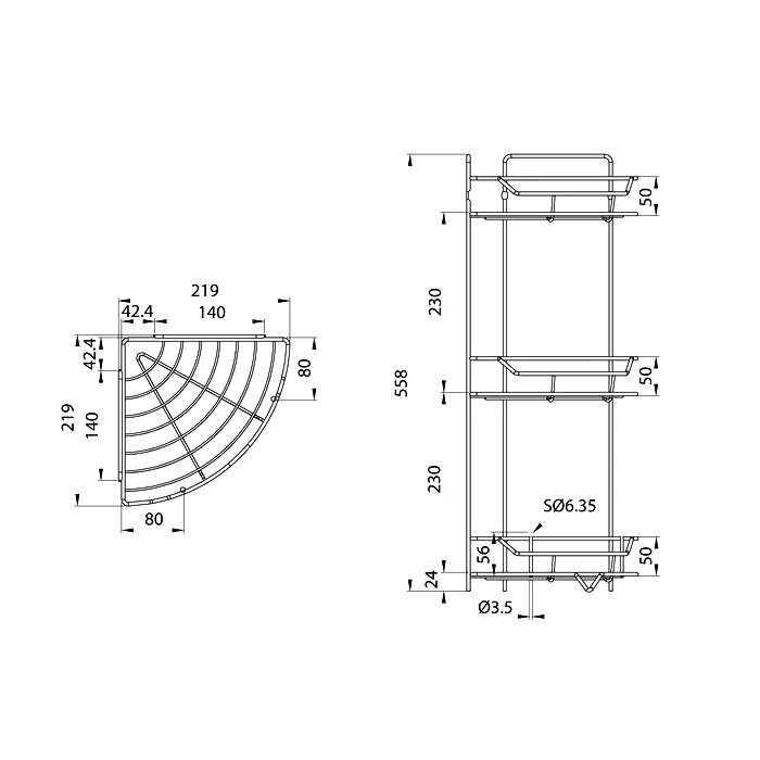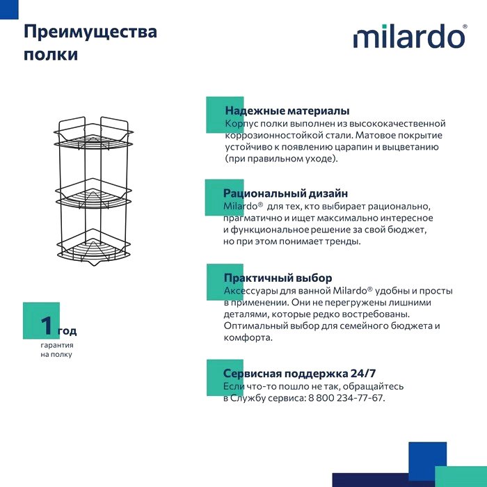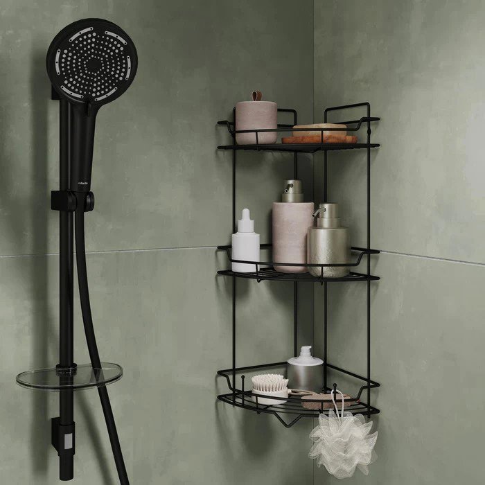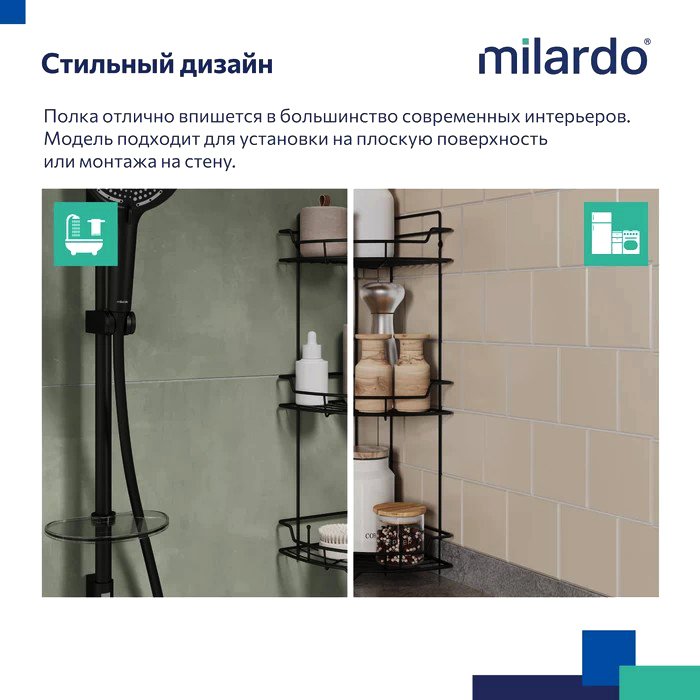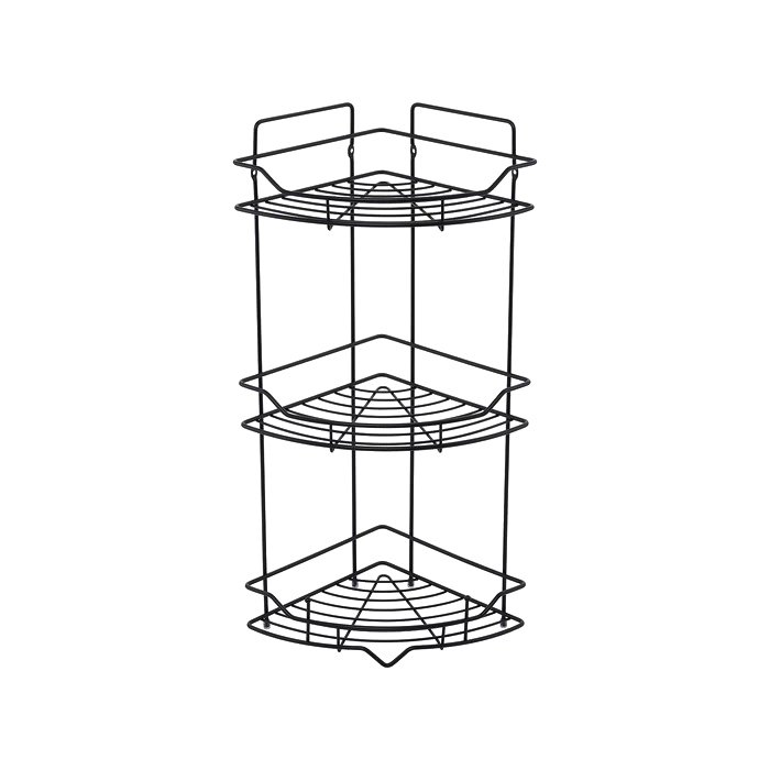 Современный дизайн коллекции Grid поможет сделать интерьер более персональным: угловая полка будет отлично смотреться в разных стилях интерьера, как ванной, так и кухни. Целых три яруса позволят эффективно использовать вертикальное пространство: для эстетичного хранения предметов первой необходимости как крупного, так и мелкого размера. Лаконичная полка Grid – это вместительный органайзер с двумя интегрированными в бортик крючками: на них будет удобно хранить дополнительные кухонные или банные аксессуары. Полку можно не только вешать на стену, но и устанавливать на плоскую поверхность за счет устойчивых упоров снизу. В этом случае на ней получится разместить и более тяжелые предметы. Решетчатое дно не даст скапливаться лишней влаге, что предотвратит появление плесени. Полка Milardo® в черном цвете выполнена из антикоррозийной стали со стойким матовым покрытием, благодаря чему она прослужит дольше во влажном помещении ванной комнаты. Высококачественная обработка сварных швов и краев проволоки облегчает уход за полкой.