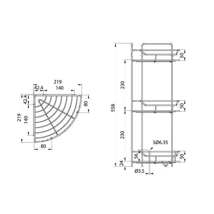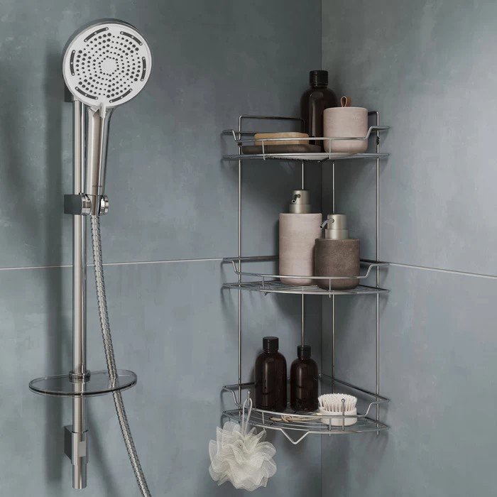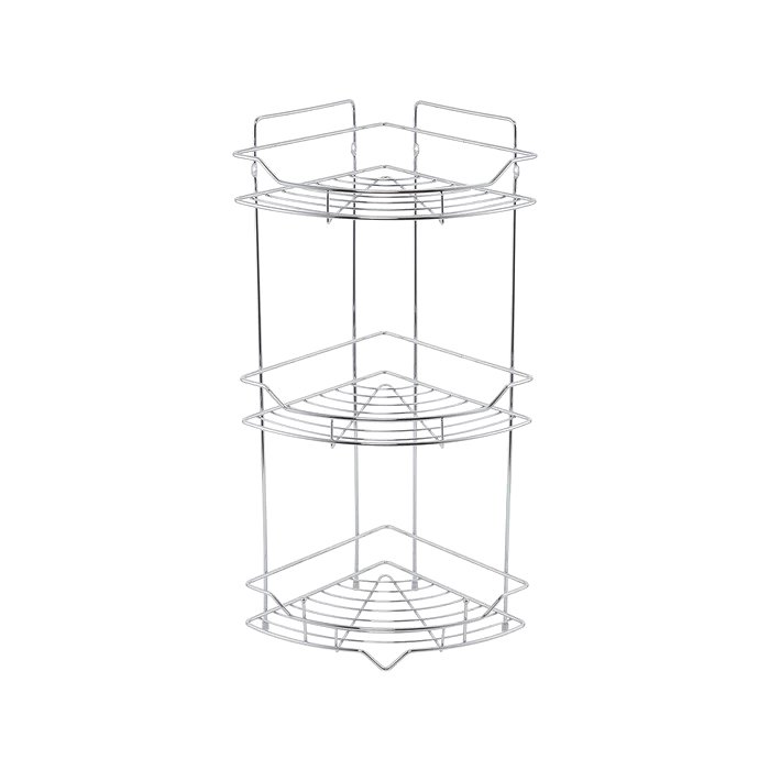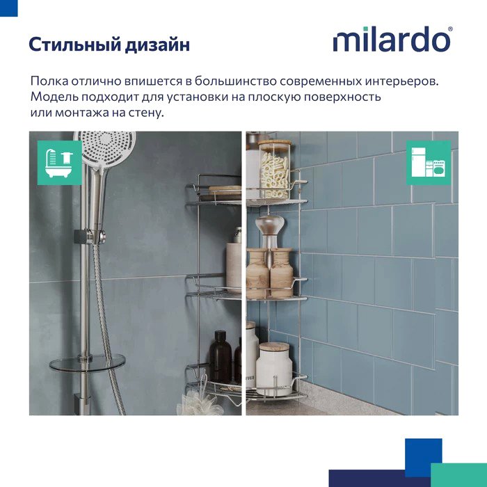 Современный дизайн коллекции Grid поможет сделать интерьер более персональным: угловая полка будет отлично смотреться в разных стилях интерьера, как ванной, так и кухни. Целых три яруса позволят эффективно использовать вертикальное пространство: для эстетичного хранения предметов первой необходимости как крупного, так и мелкого размера. Лаконичная полка Grid – это вместительный органайзер с двумя интегрированными в бортик крючками: на них будет удобно хранить дополнительные кухонные или банные аксессуары. Полку можно не только вешать на стену, но и устанавливать на плоскую поверхность за счет устойчивых упоров снизу. В этом случае на ней получится разместить и более тяжелые предметы. Решетчатое дно не даст скапливаться лишней влаге, что предотвратит появление плесени. Полка Milardo® выполнена из антикоррозийной стали с никель-хромовым покрытием, благодаря чему она прослужит дольше во влажном помещении ванной комнаты. Высококачественная обработка сварных швов и краев проволоки облегчает уход за полкой.