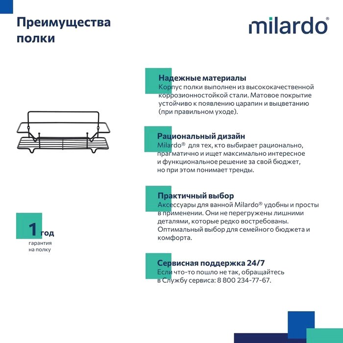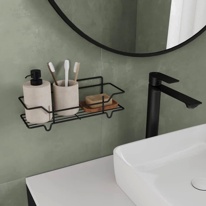 Современный дизайн коллекции Grid поможет сделать интерьер более персональным: лаконичная полка будет отлично смотреться в разных стилях интерьера ванной комнаты. У модели один ярус для эстетичного и компактного хранения самого необходимого, а в ее бортик интегрировано 2 крючка – на них будет удобно размещать мочалки и другие небольшие банные аксессуары. За счет устойчивых упоров снизу полку можно не только крепить к стене, но и устанавливать на плоскую поверхность. Решетчатое дно не даст скапливаться лишней влаге, что предотвратит появление плесени. Полка Milardo® в черном цвете выполнена из антикоррозийной стали со стойким матовым покрытием, благодаря чему она прослужит дольше во влажном помещении ванной комнаты. Высококачественная обработка сварных швов и краев проволоки облегчает уход за полкой. Минималистичные крепежные детали не портят внешний вид аксессуара и идут в комплекте.