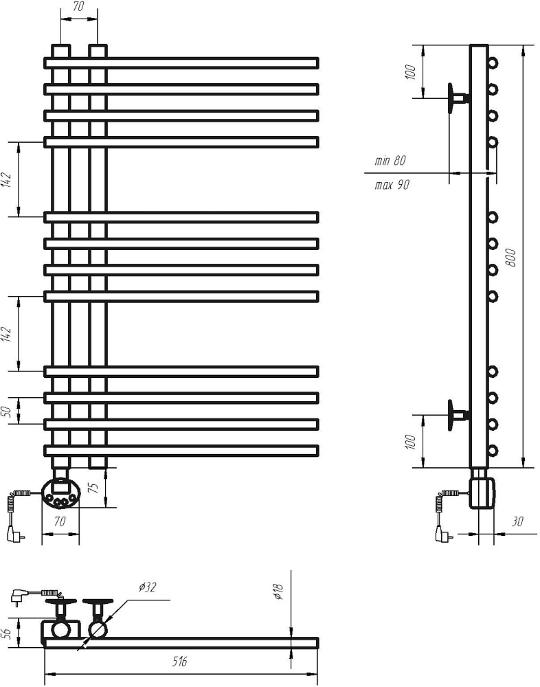Труба полотенцесушителя электросварная, толщиной 2 мм, что обеспечивает прочность и устойчивость к коррозии. Вертикальные стойки имеют диаметр 32 мм, а горизонтальные перекладины выполнены из трубы диаметром 18 мм.