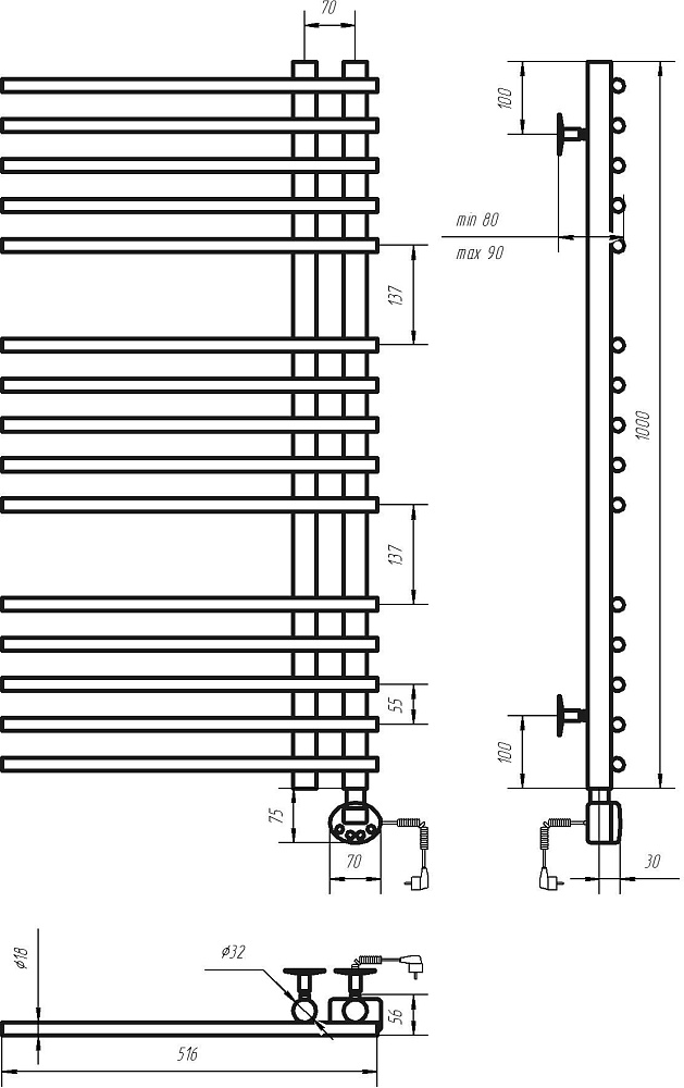 ТЭН полотенцесушителя оснащен цифровым терморегулятором, позволяющим устанавливать температуру от 35 до 65 градусов. Встроенный таймер автоотключения на 2 и 4 часа обеспечивает удобство использования. Два термодатчика защищают устройство от перегрева, обеспечивая безопасность использования. Для скрытого подключения необходим бокс (продается отдельно). Устройство потребляет небольшое количество электроэнергии и может работать на протяжении длительного периода времени без отключения от сети; является дополнительным источником отопления в комнате, можно использовать в ванных комнатах для сушки белья, полотенец.