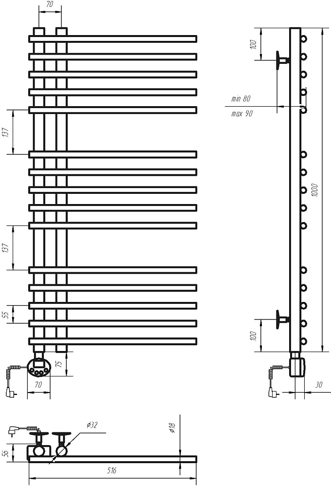 Труба полотенцесушителя электросварная, толщиной 2 мм, что обеспечивает прочность и устойчивость к коррозии. Вертикальные стойки имеют диаметр 32 мм, а горизонтальные перекладины выполнены из трубы диаметром 18 мм.