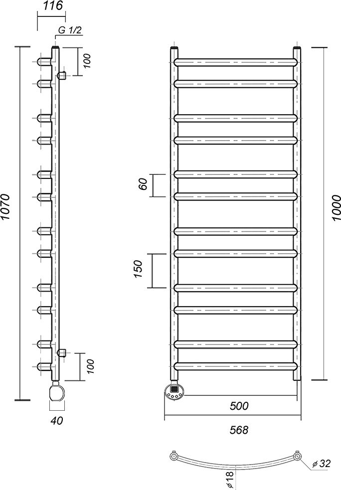 Труба полотенцесушителя электросварная, толщиной 2 мм, что обеспечивает прочность и устойчивость к коррозии. Вертикальные стойки имеют диаметр 32 мм, а горизонтальные перекладины выполнены из трубы диаметром 18 мм.