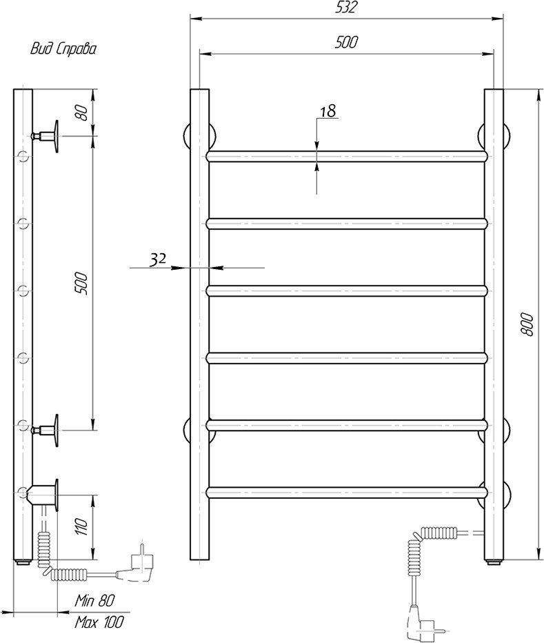 Полотенцесушитель оснащен вертикальными стойками диаметром 32 мм и горизонтальными перекладинами диаметром 18 мм, выполненными из трубы толщиной 1,5 мм. Это обеспечивает прочность и устойчивость конструкции.