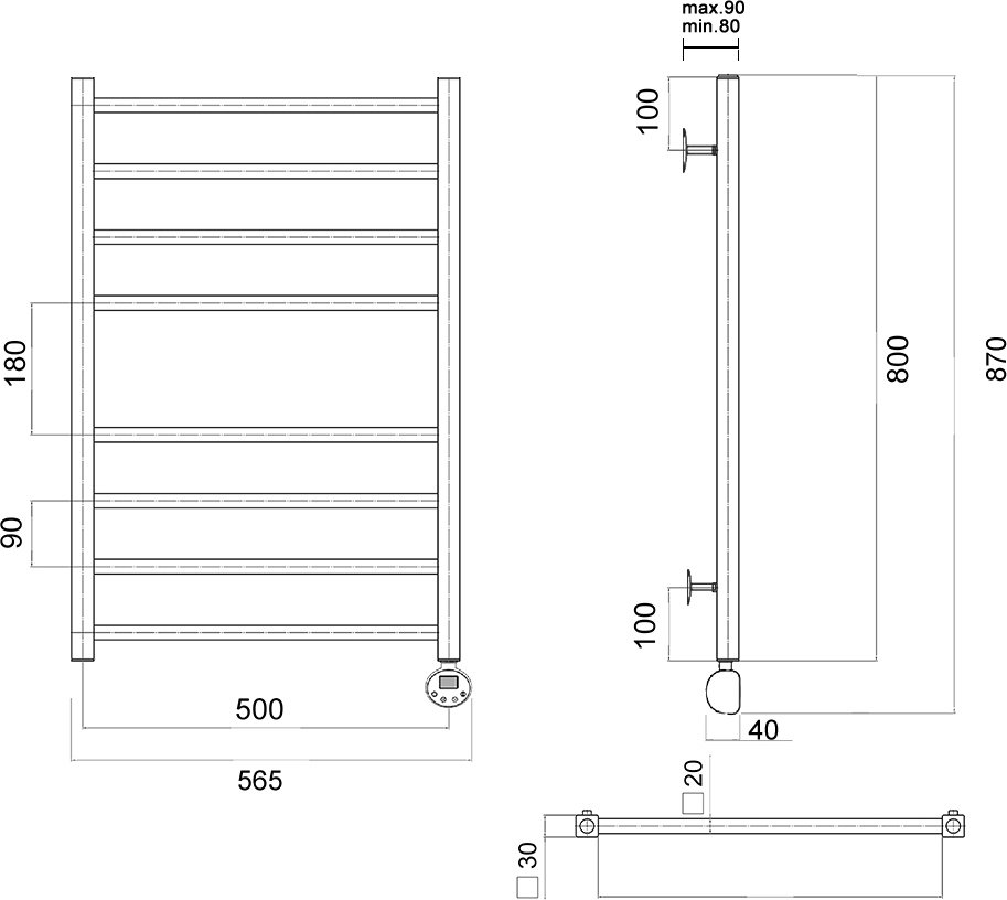 ТЭН полотенцесушителя оснащен цифровым терморегулятором, позволяющим устанавливать температуру от 35 до 65 градусов. Встроенный таймер автоотключения на 2 и 4 часа обеспечивает удобство использования. Два термодатчика защищают устройство от перегрева, обеспечивая безопасность использования. Для скрытого подключения необходим бокс (продается отдельно). Устройство потребляет небольшое количество электроэнергии и может работать на протяжении длительного периода времени без отключения от сети; является дополнительным источником отопления в комнате, можно использовать в ванных комнатах для сушки белья, полотенец.