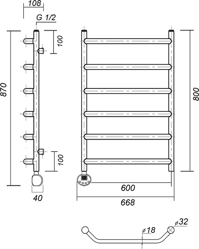 Труба полотенцесушителя электросварная, толщиной 2 мм, что обеспечивает прочность и устойчивость к коррозии. Вертикальные стойки имеют диаметр 32 мм, а горизонтальные перекладины выполнены из трубы диаметром 18 мм.