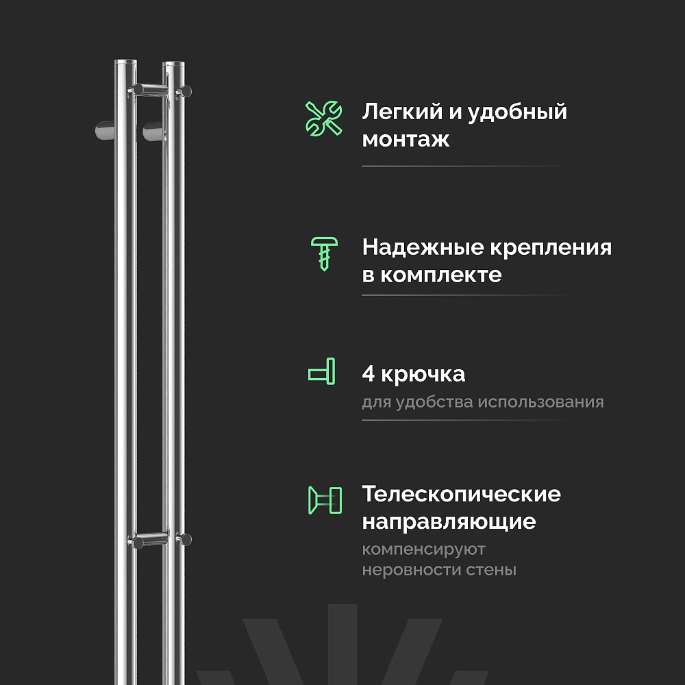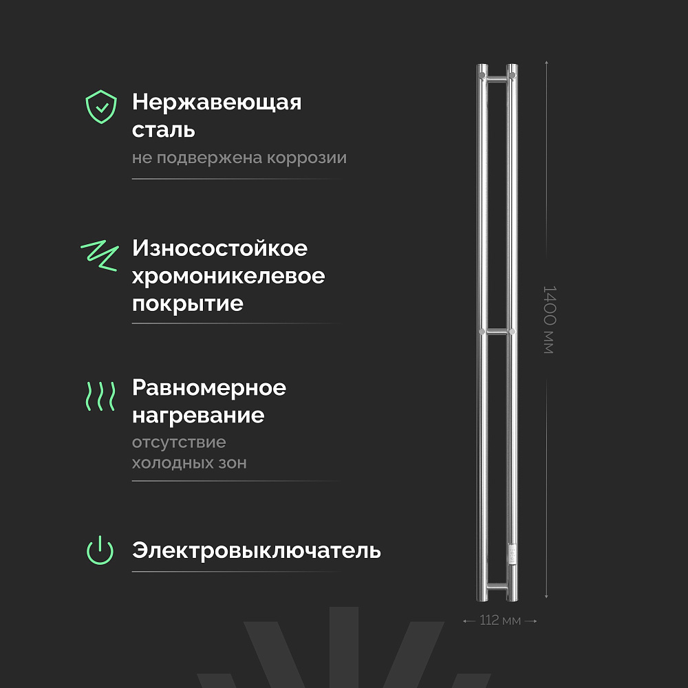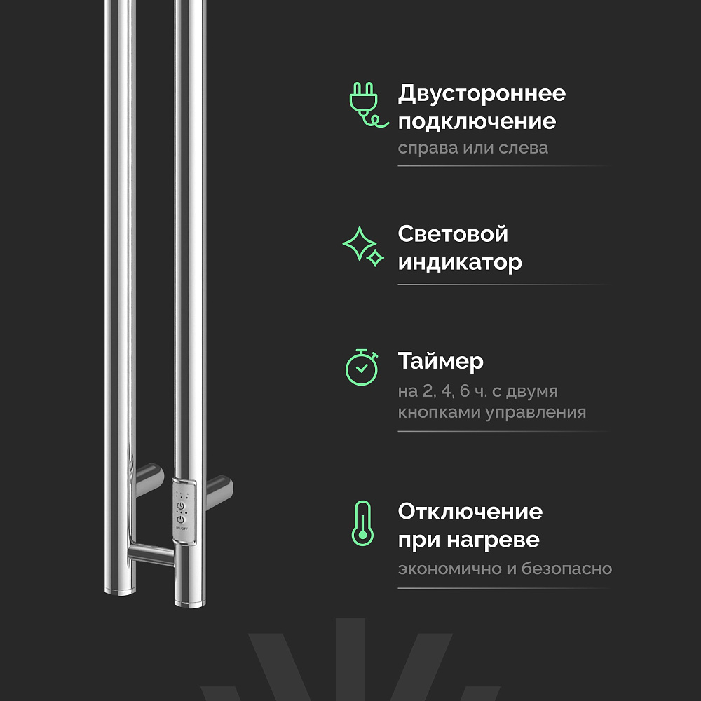 Полотенцесушитель электрический EWRIKA Пенелопа Х2 140x10 см, подключение справа, слева, скрытое подключение справа, хром, I-образный