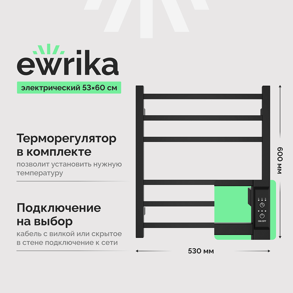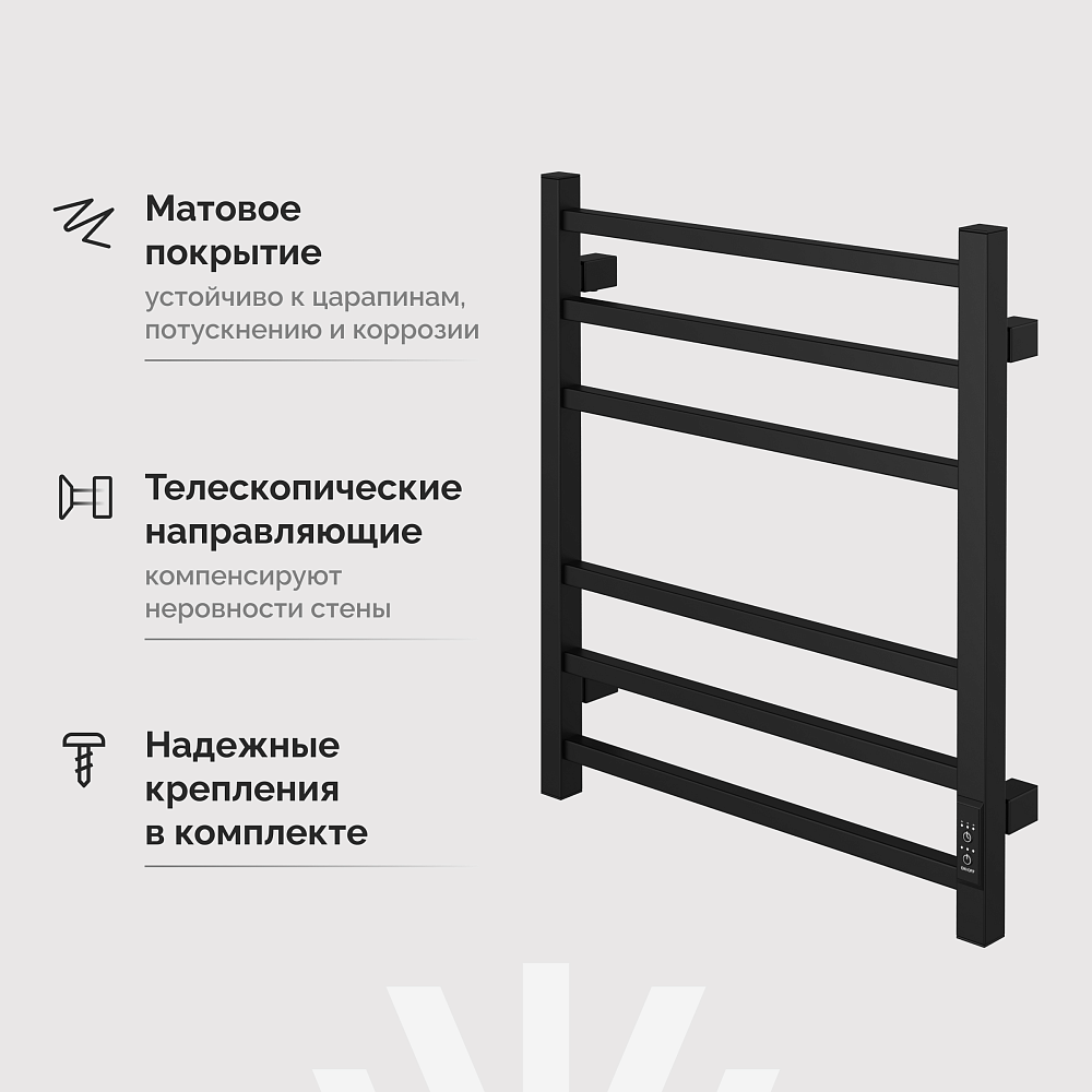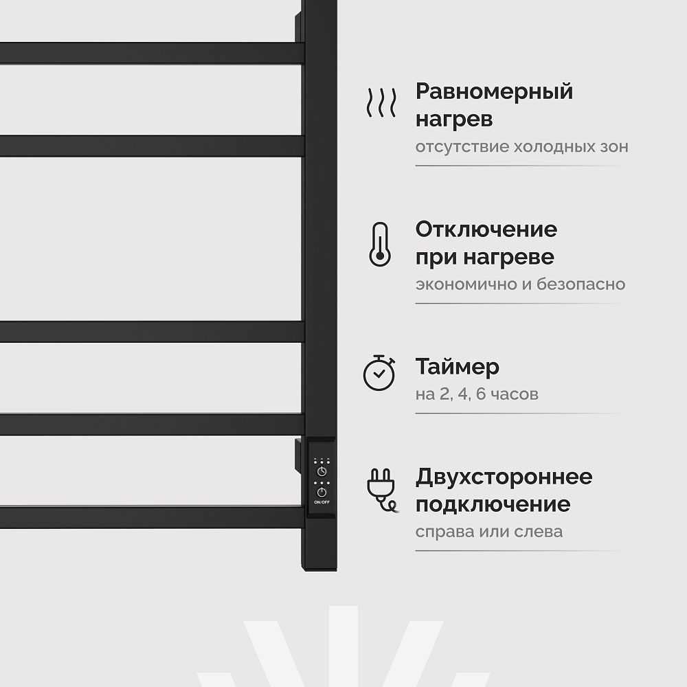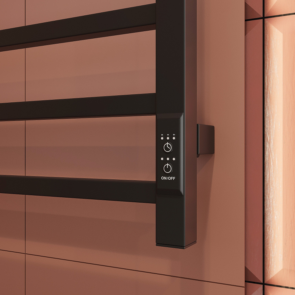 Электрический полотенцесушитель EWRIKA «Пенелопа L2» — это стильное и функциональное решение для вашей ванной комнаты. Его элегантный чёрный корпус станет гармоничным дополнением любого интерьера, а продуманная конструкция позволяет подключить прибор к электросети в любом месте, независимо от расположения розетки. На корпусе полотенцесушителя уже установлена коробка под скрытый монтаж, окрашенная в цвет корпуса. Это делает процесс установки максимально простым и удобным. Блок управления с двумя кнопками на корпусе даёт возможность легко регулировать работу полотенцесушителя. Кнопка включения и выключения позволяет быстро настроить работу прибора, а кнопка таймера (с возможностью выбора времени — 2, 4 или 6 часов) даёт возможность оптимизировать расход электроэнергии и обеспечить комфортную температуру в ванной комнате в нужное время. EWRIKA «Пенелопа L2» — это не только практичный, но и стильный аксессуар для вашей ванной комнаты. Он поможет создать уютную и комфортную атмосферу, а также станет надёжным помощником в сушке полотенец и белья.