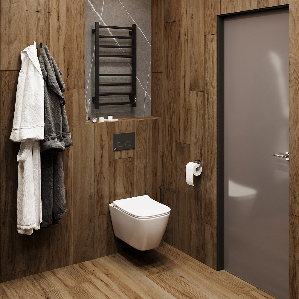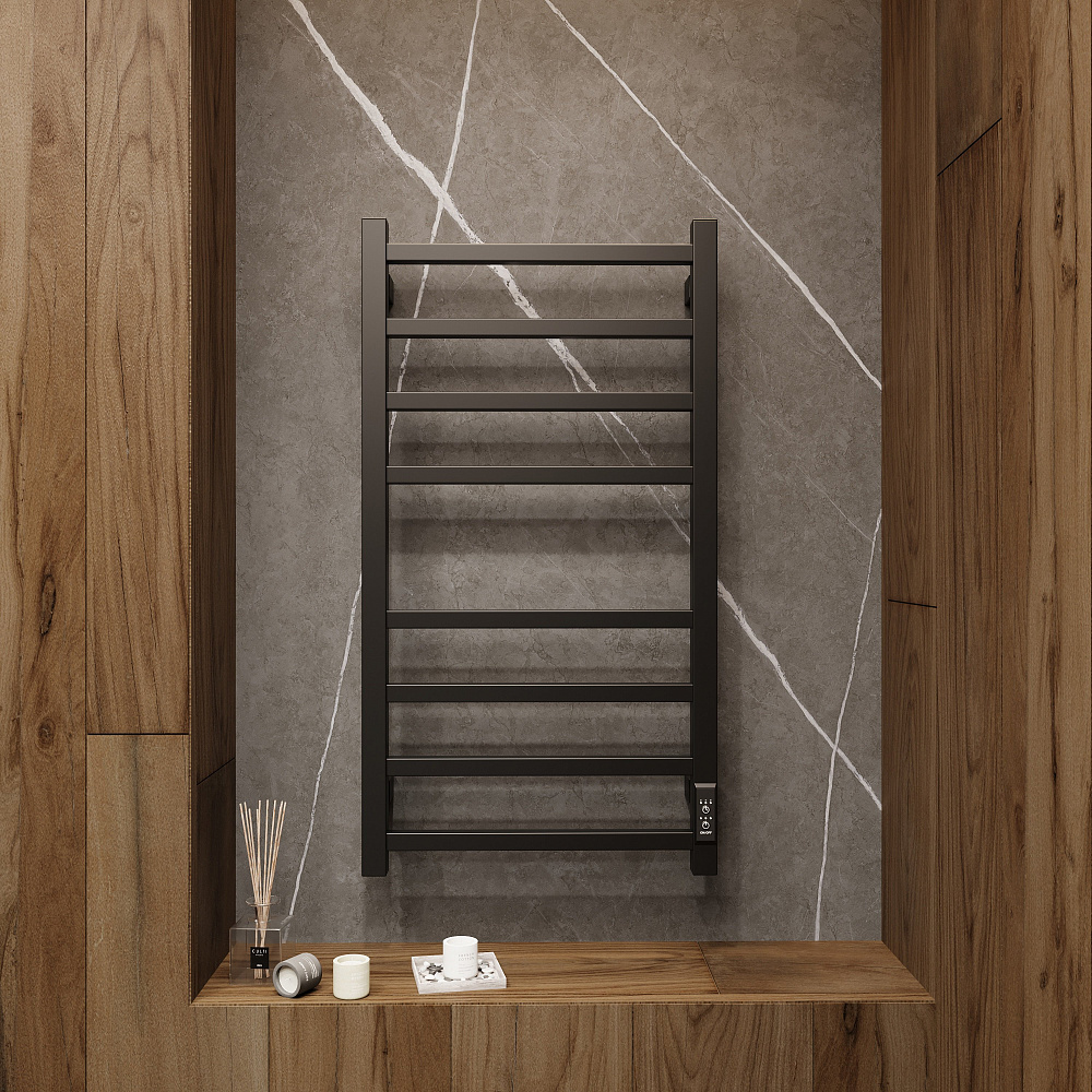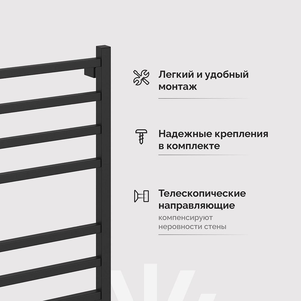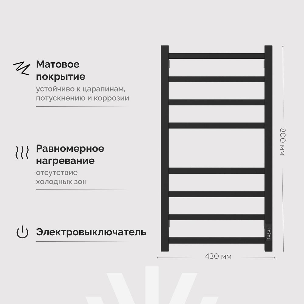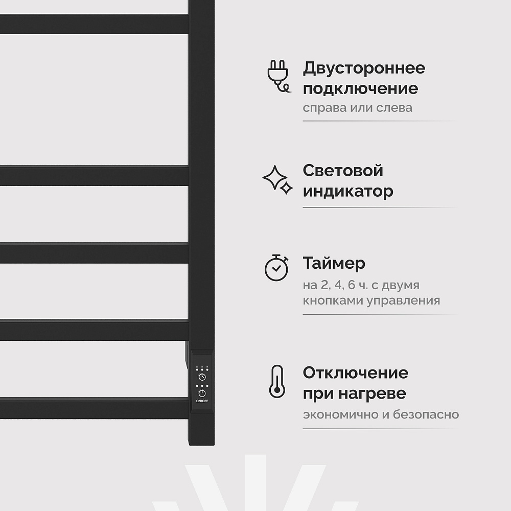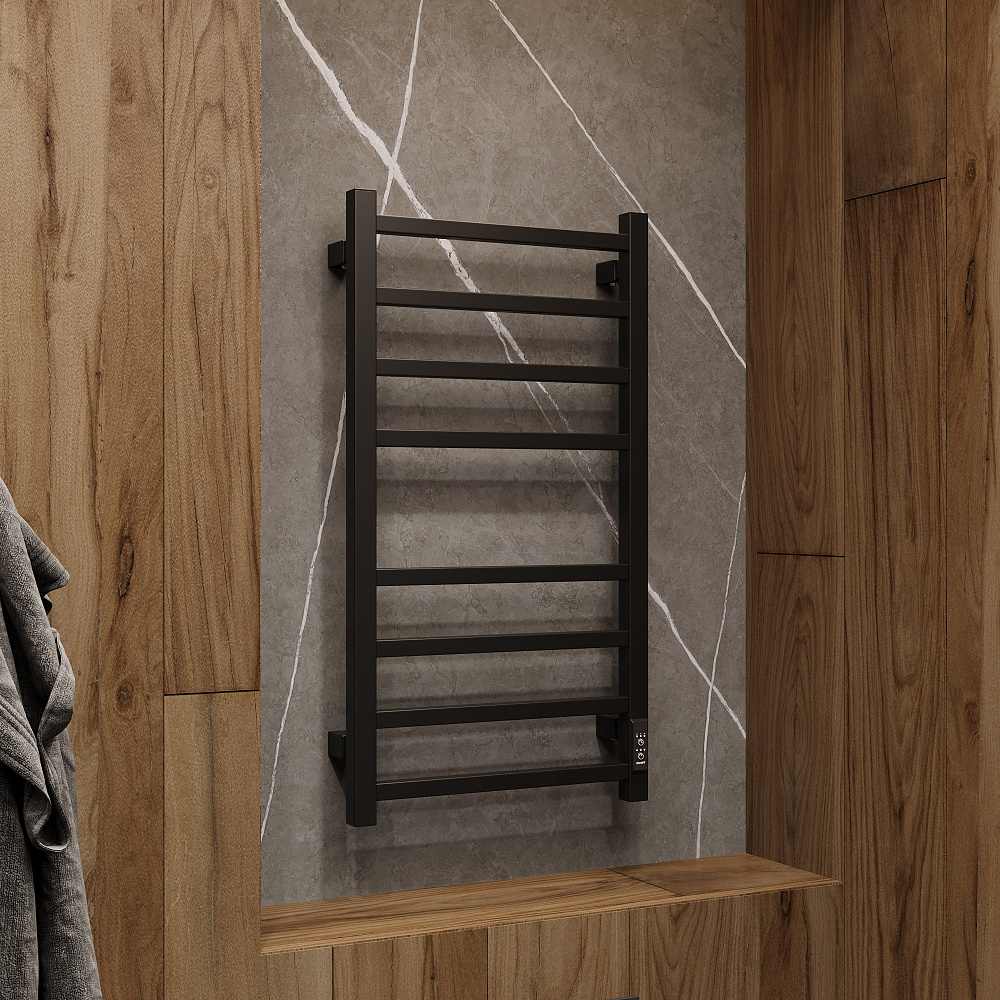 Полотенцесушитель электрический EWRIKA Пенелопа L2 80x45 см, подключение справа, слева, скрытое подключение справа, матовый черный, лесенка, из стали