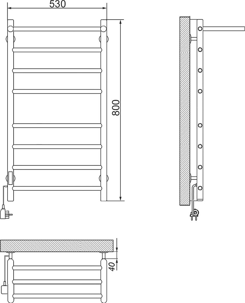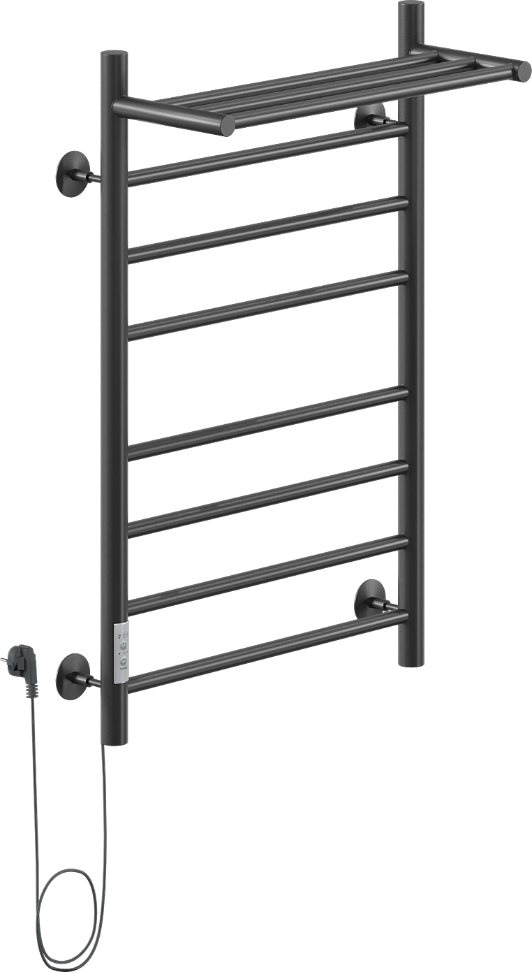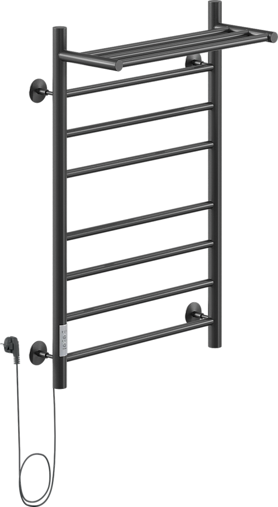 Полотенцесушитель электрический Ника Way 2 80x55 см, подключение слева, скрытое подключение слева, матовый черный, лесенка, из стали, с полкой