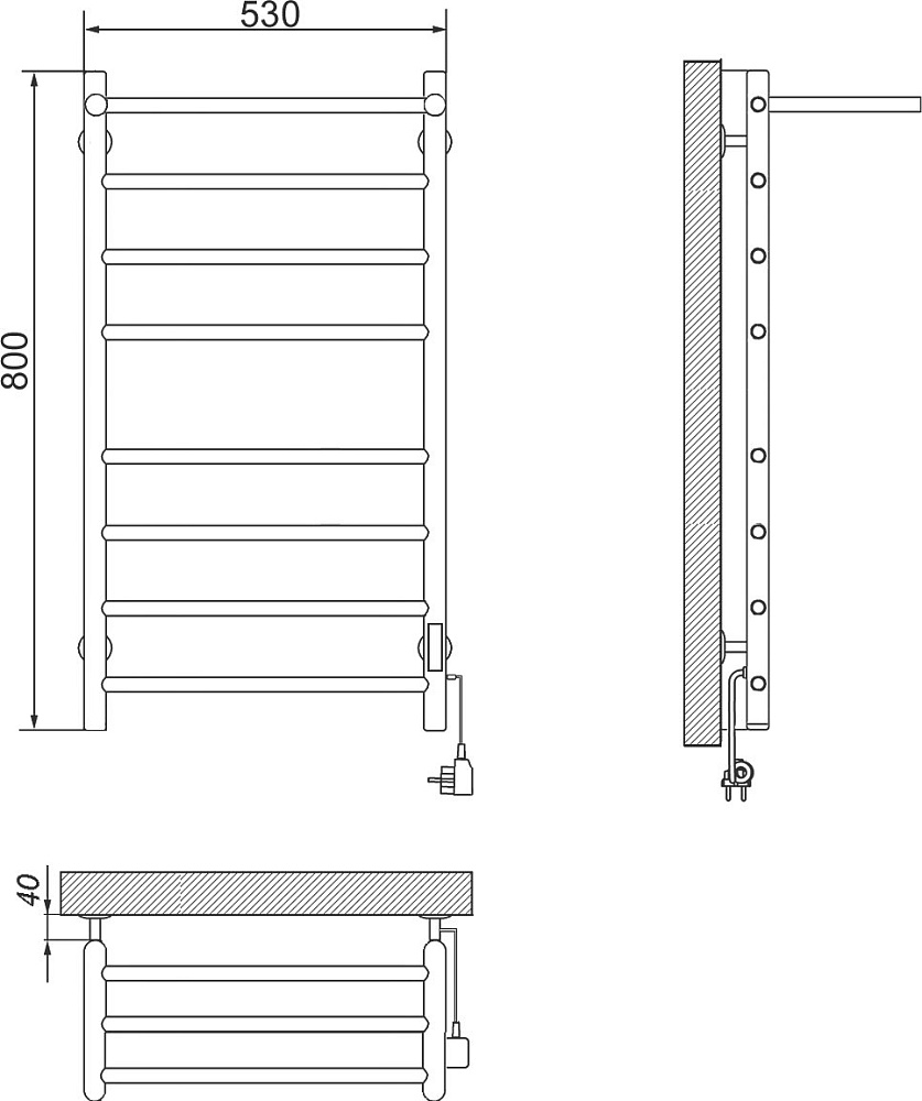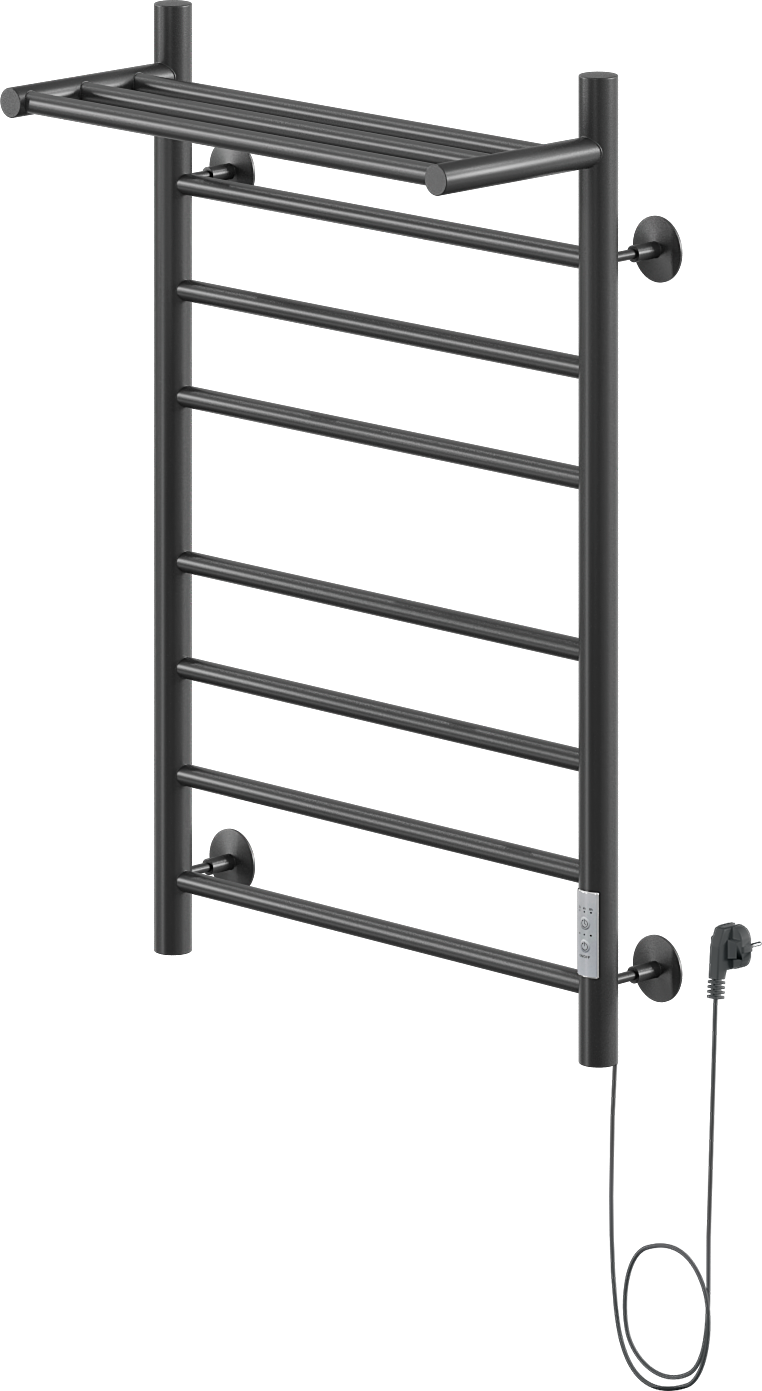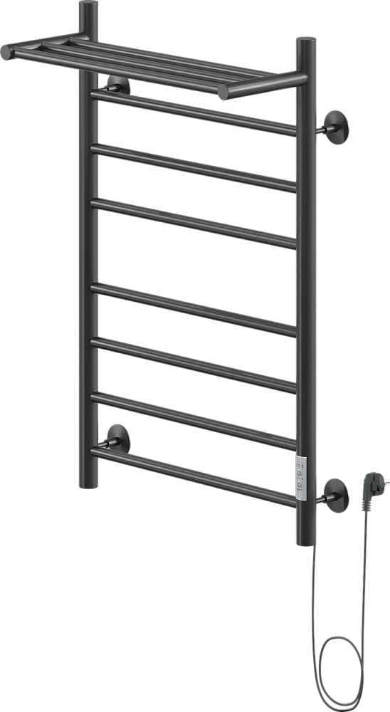 Полотенцесушитель электрический Ника Way 2 80x55 см, подключение справа, скрытое подключение справа, матовый черный, лесенка, из стали, с полкой