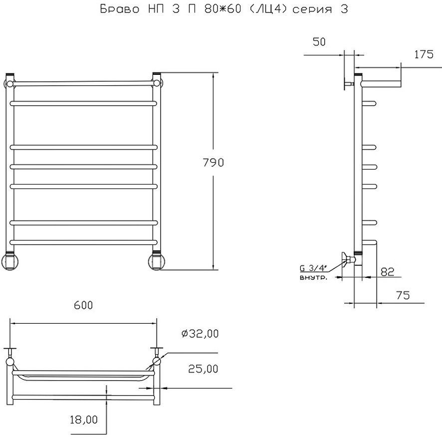 Полотенцесушитель водяной Тругор ЛЦ Браво НП 3 П 80x65 см, хром, лесенка, с полкой