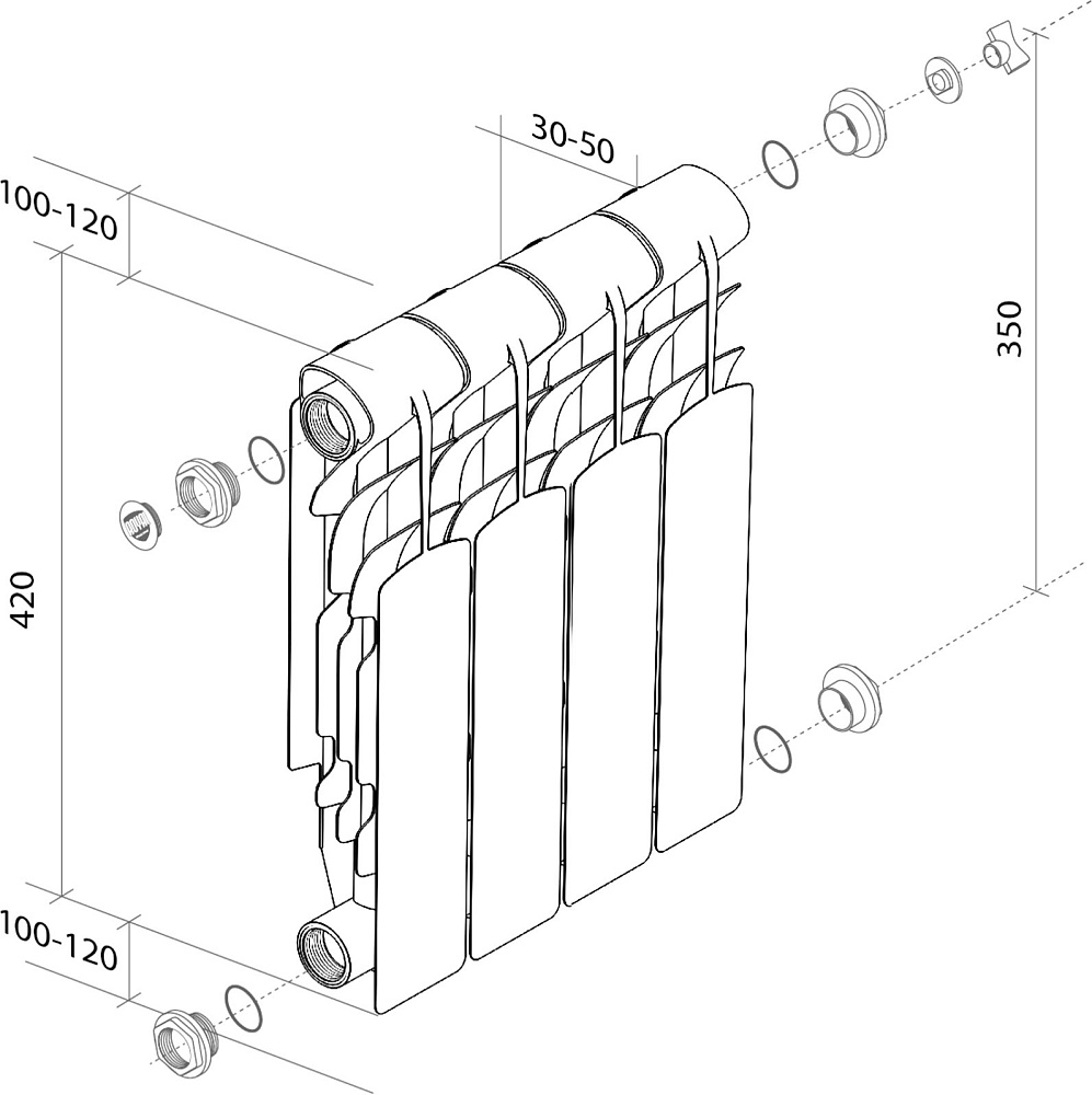 Радиатор алюминиевый секционный Royal Thermo Revolution 350 4 секции, боковое проходное подключение, белый
