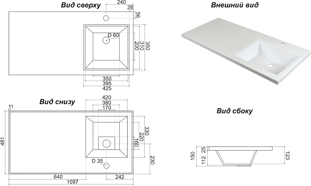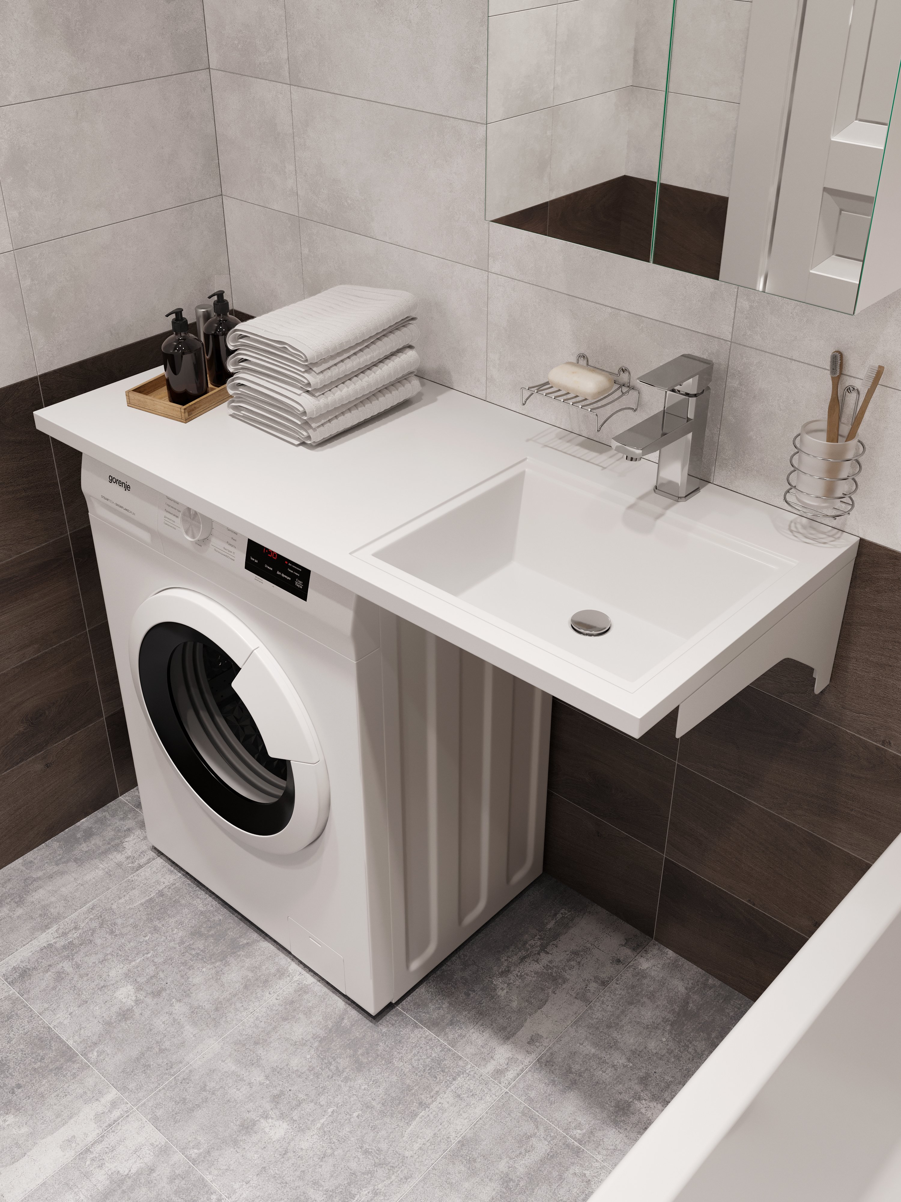 Раковина над стиральной машиной DIWO Тольятти 110 R глянцевая белая, прямоугольная, искусственный камень, со столешницей слева, с комплектом кронштейнов