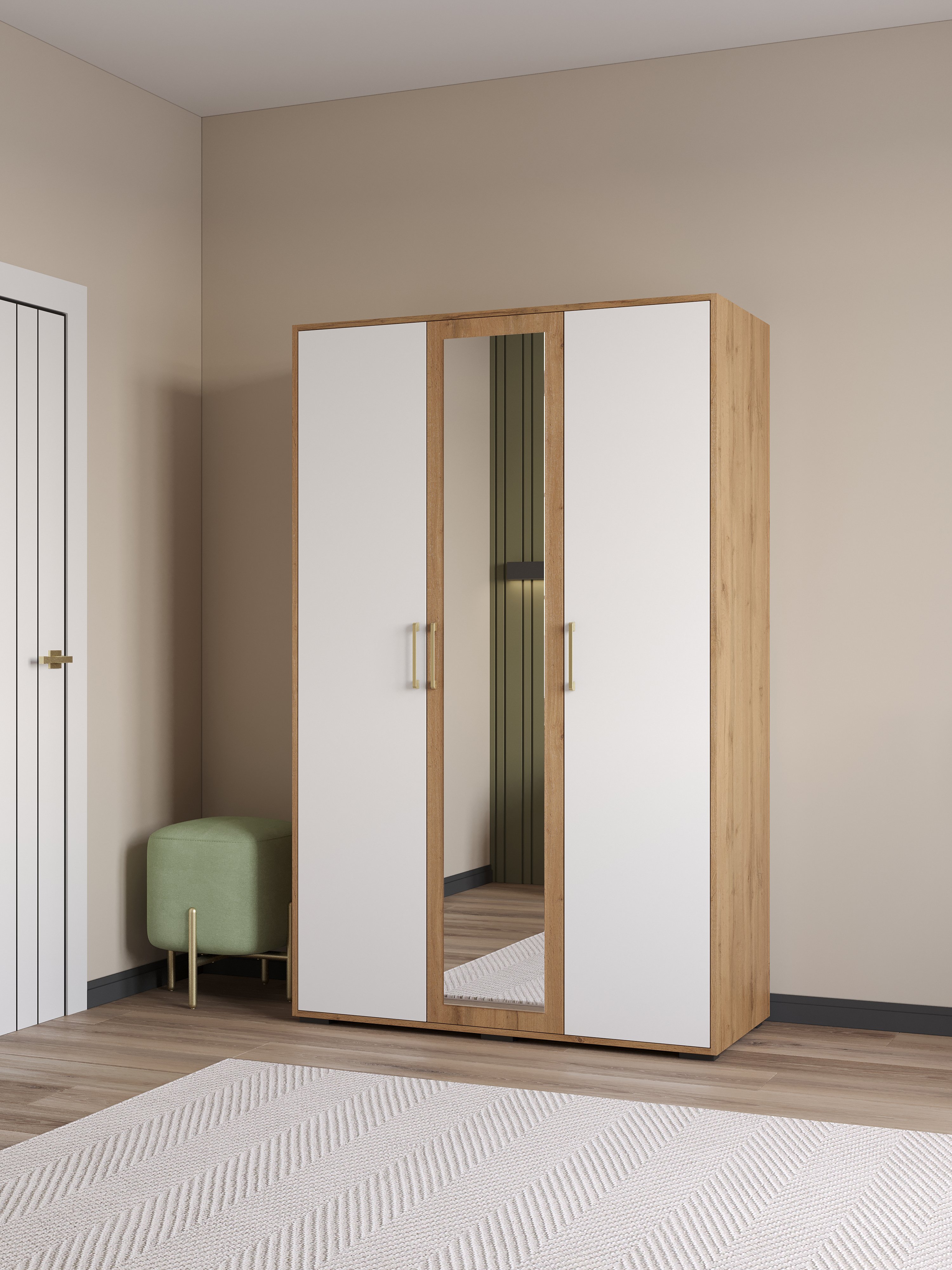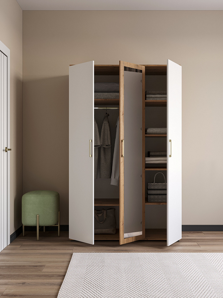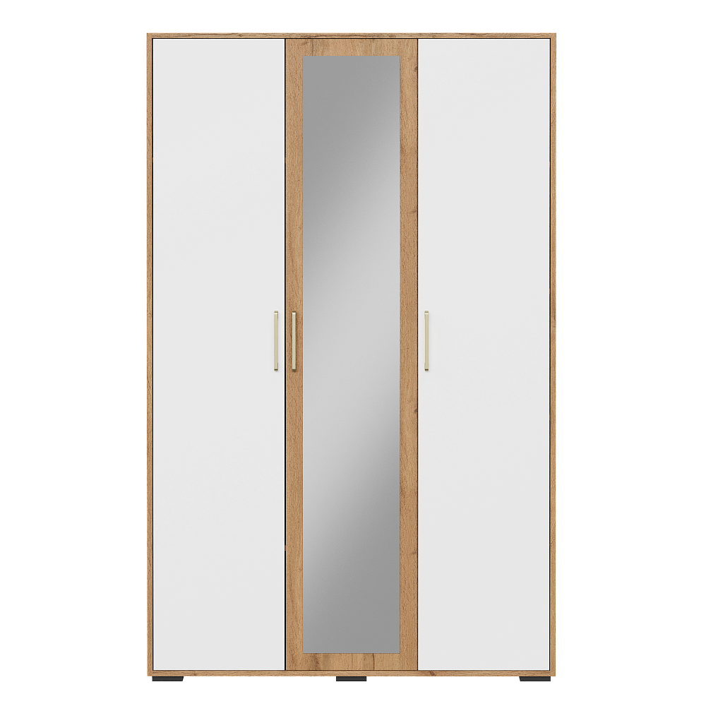 Шкаф для одежды DIWO Кострома 120x191х52 см, трехдверный с зеркалом, белый, дуб вотан, ручка золото
