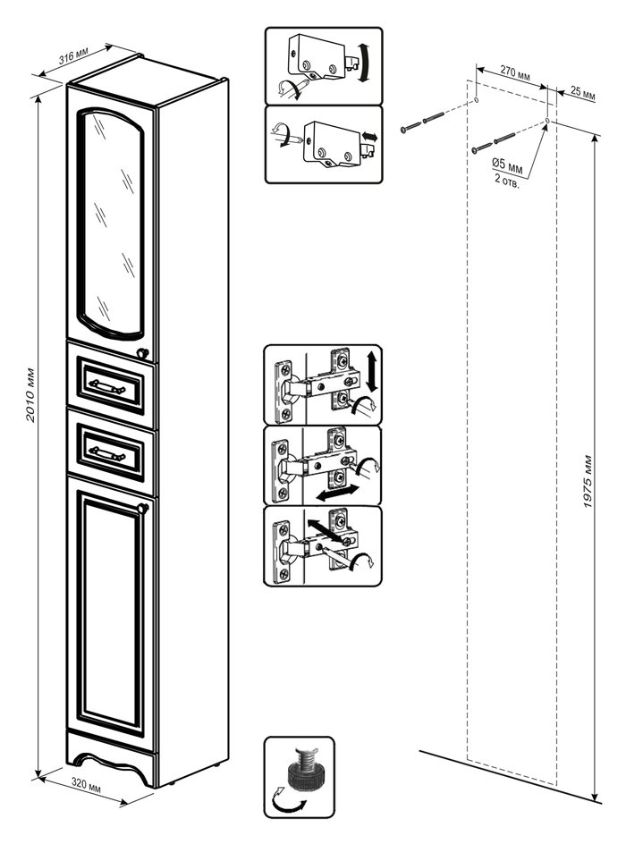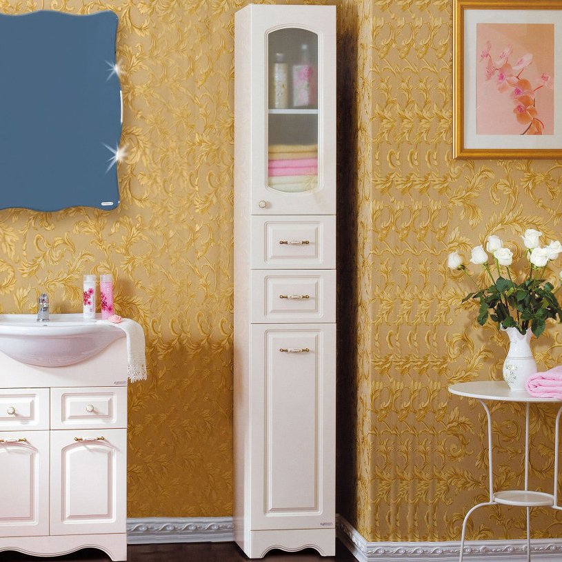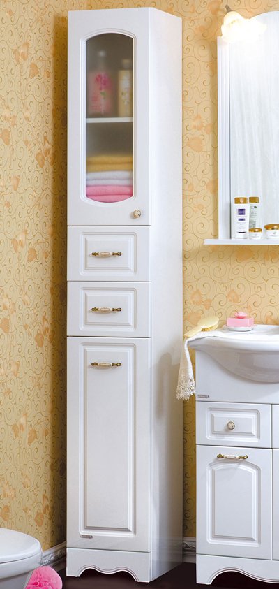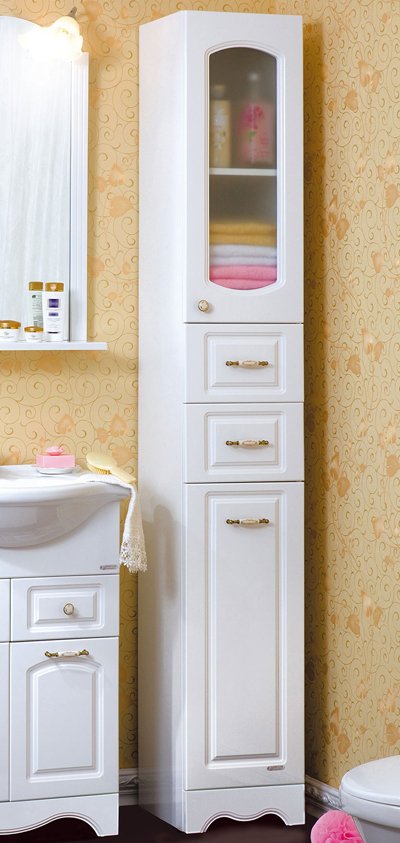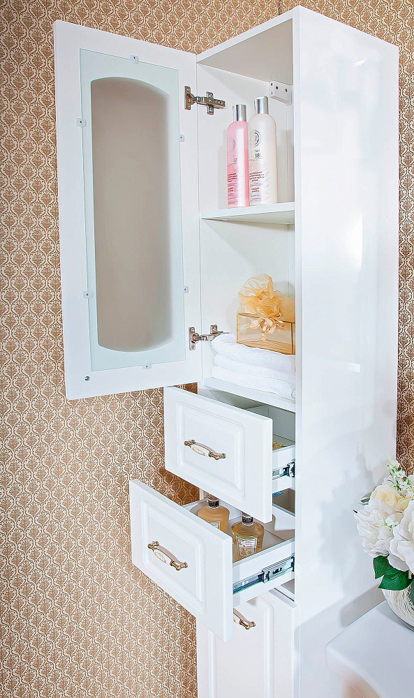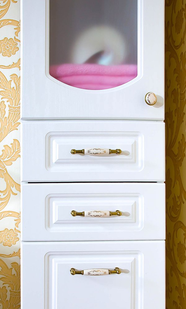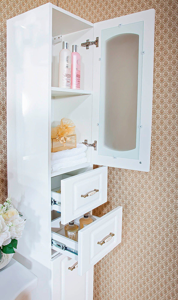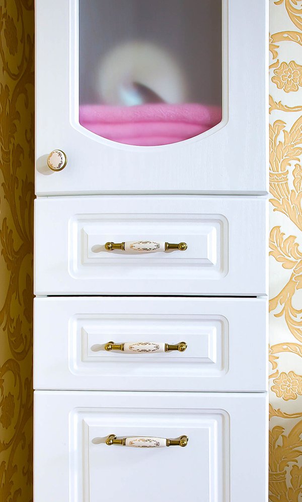 Очаровательный пенал «Анна» белого цвета декорирован функциональными ручками под бронзу с выразительными белыми вставками из фарфора. Универсальная модель, выполненная под старину, изготовлена из современных качественных материалов. Для сборки применяют комплектующие европейского производства. Корпус выполнен из ДСП, фасад – из МДФ. Для ламинирования используют глянцевую пленку белого цвета, выполняющую защитную и декоративную функции. Верхняя дверца с витражом из матового стекла придает конструкции визуальную легкость.В петли распашных дверей и направляющие выдвижных ящиков интегрированы доводчики, обеспечивающие плавное закрывание отсеков.
