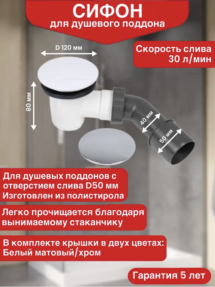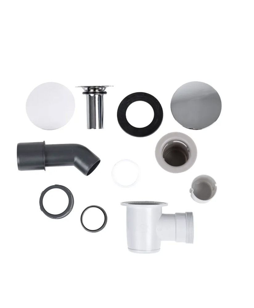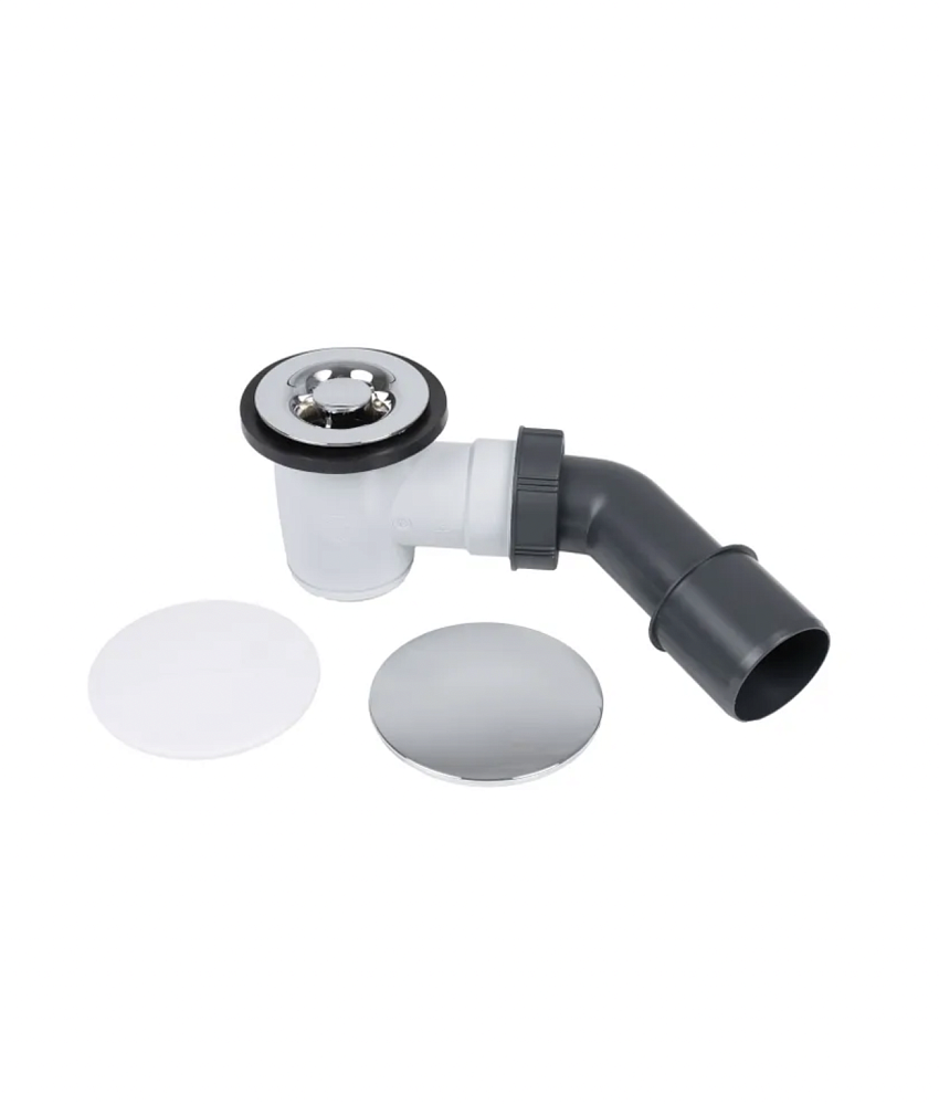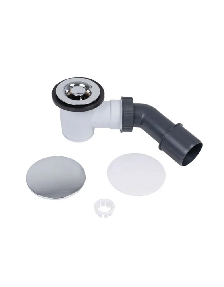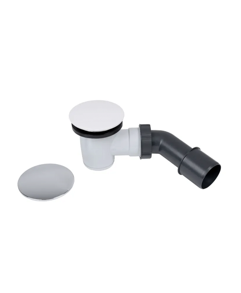 Сифон выполнен из прочного полистирола, устойчивого к воздействию влаги и химических веществ. В комплекте предусмотрены две сменные крышки: белая матовая и хромированная – они идеально впишутся как в современный минималистичный интерьер, так и в классический стиль ванной комнаты. Жесткий патрубок обеспечивает надежный отвод воды и простоту монтажа.