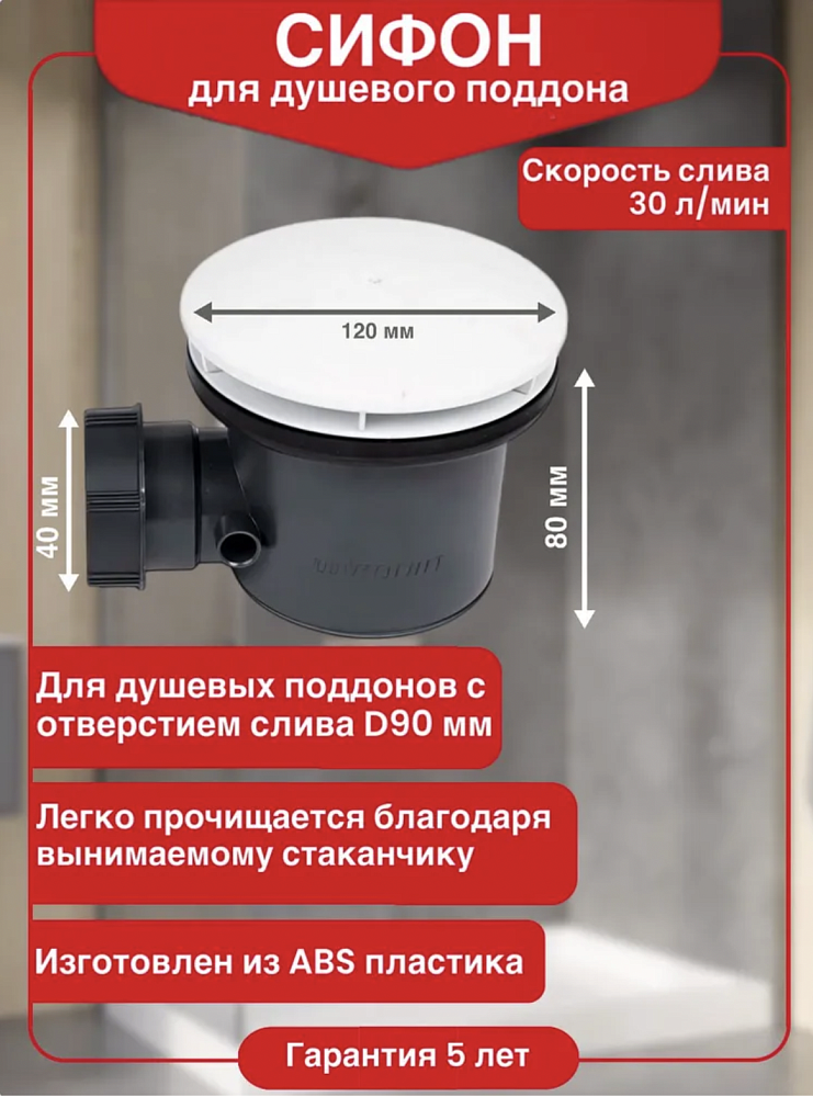 Устройство оснащено гидрозатвором высотой 50 мм, который эффективно предотвращает появление неприятных запахов из канализации. Вынимаемый стаканчик позволяет легко прочищать слив, обеспечивая беспрепятственное прохождение воды и предотвращая засоры. Высокая пропускная способность сифона составляет до 30 литров в минуту при высоте воды 120 мм, что гарантирует быстрый отвод жидкости даже при интенсивном использовании душа.