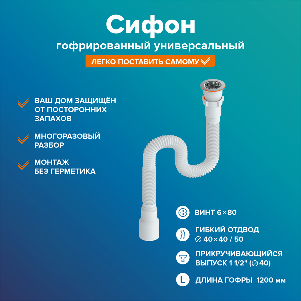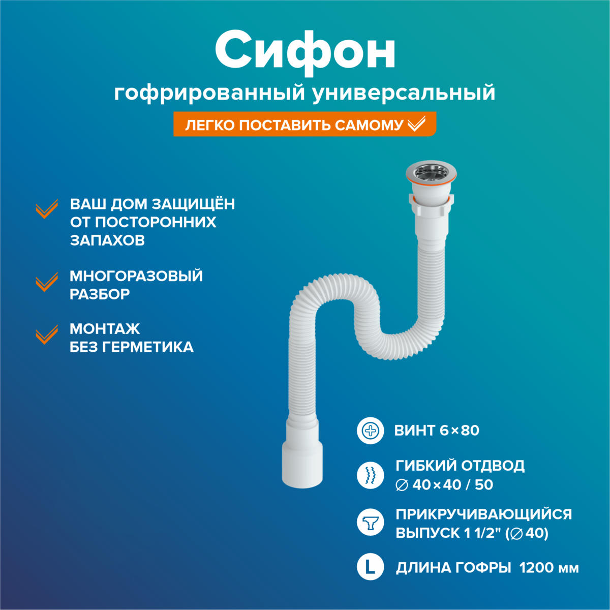 Сифон гофрированный универсальный РМС СГУ СГУ-1,2 — это надёжное и практичное решение для вашей раковины. Благодаря своей конструкции и качественным материалам, он обеспечивает эффективный отвод воды и предотвращает засоры. Длина сифона составляет 800 мм, что позволяет удобно разместить его в любом санузле.Прикручивающийся выпуск 1 ½ (40) гарантирует простоту монтажа и надёжное соединение с канализацией. Винт 6х80 обеспечивает прочное крепление сифона к раковине, а чашка из нержавеющей стали придаёт изделию стильный вид и долговечность.Гибкий отвод в канализацию 40х40/50 позволяет адаптировать сифон под различные типы канализационных систем. Прямое (вертикальное) подключение выпуска упрощает процесс установки и делает его более удобным.Сифон РМС СГУ СГУ-1,2 изготовлен из качественных материалов, что обеспечивает его долговечность и надёжность в эксплуатации. Он станет незаменимым элементом вашей сантехники, обеспечивая бесперебойную работу и чистоту в ванной комнате. Выбирая сифон гофрированный универсальный РМС СГУ СГУ-1,2, вы получаете не только функциональное, но и стильное решение для вашей раковины.