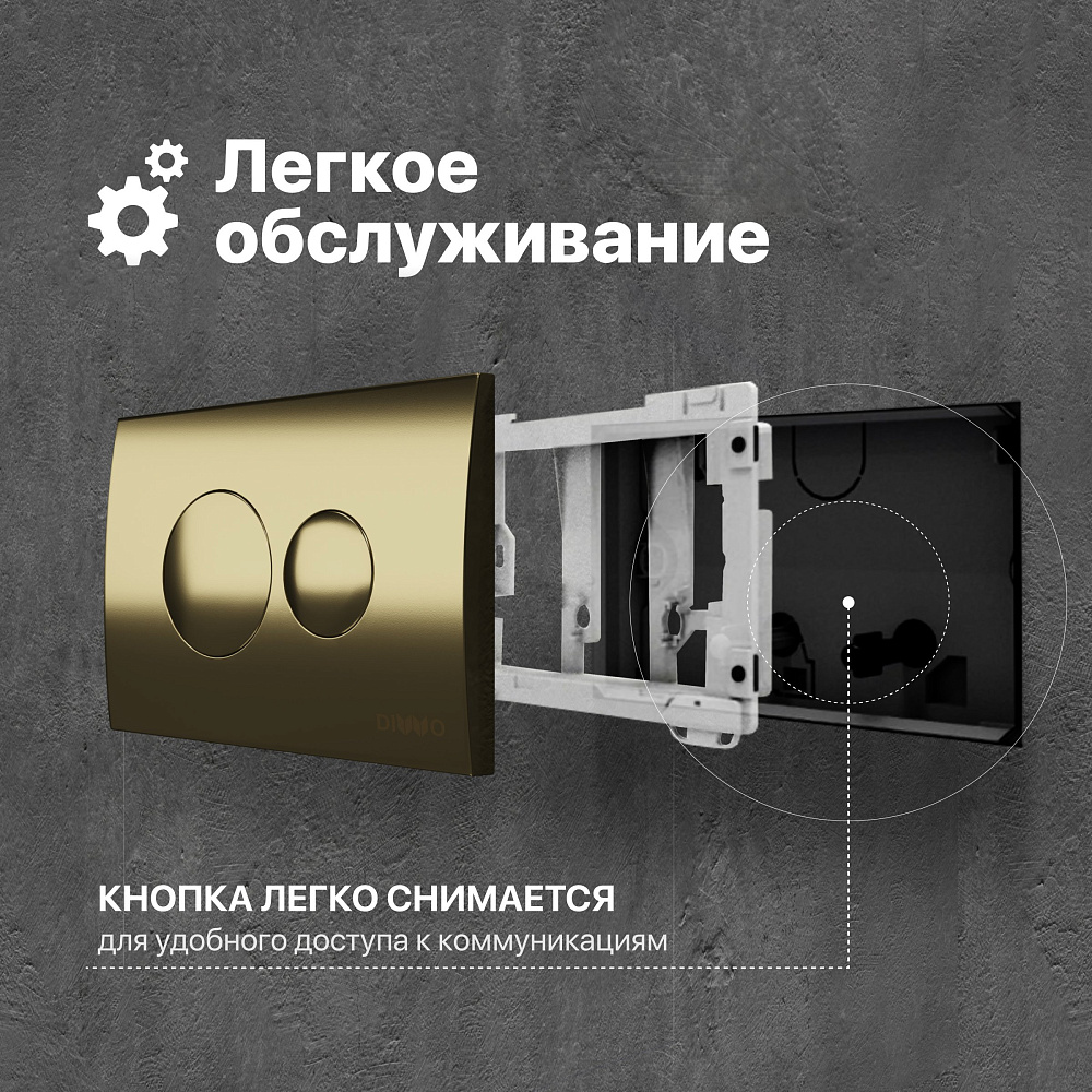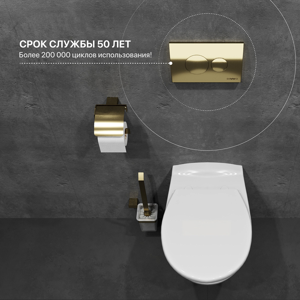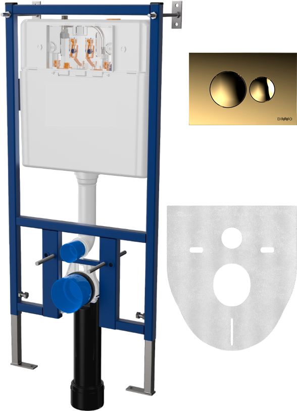 Система инсталляции для унитазов DIWO 4501 имеет продуманное оснащение — кнопку смыва DIWO 7315 в оттенке «золото», шумоизоляционную прокладку для поглощения вибраций, смывной бачок и набор креплений. На панели смыва расположены две круглые клавиши, которые отвечают за полный и частичный спуск воды. Механизм кнопки рассчитан более чем на 200 000 циклов использования (хватит на 50 лет службы). За кнопкой установлена прозрачная панель, которая обеспечит легкий доступ к ревизионному окну.