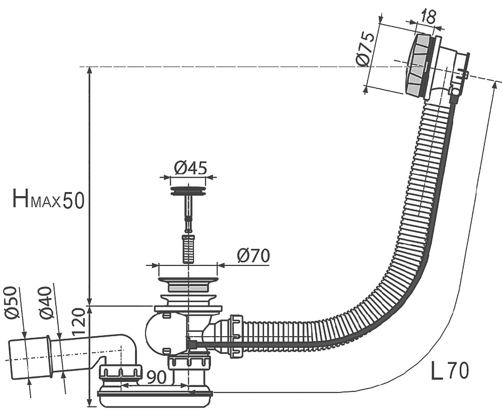 Слив-перелив для ванны Aquanet 335450 52 мм, полуавтомат, хром, с сифоном